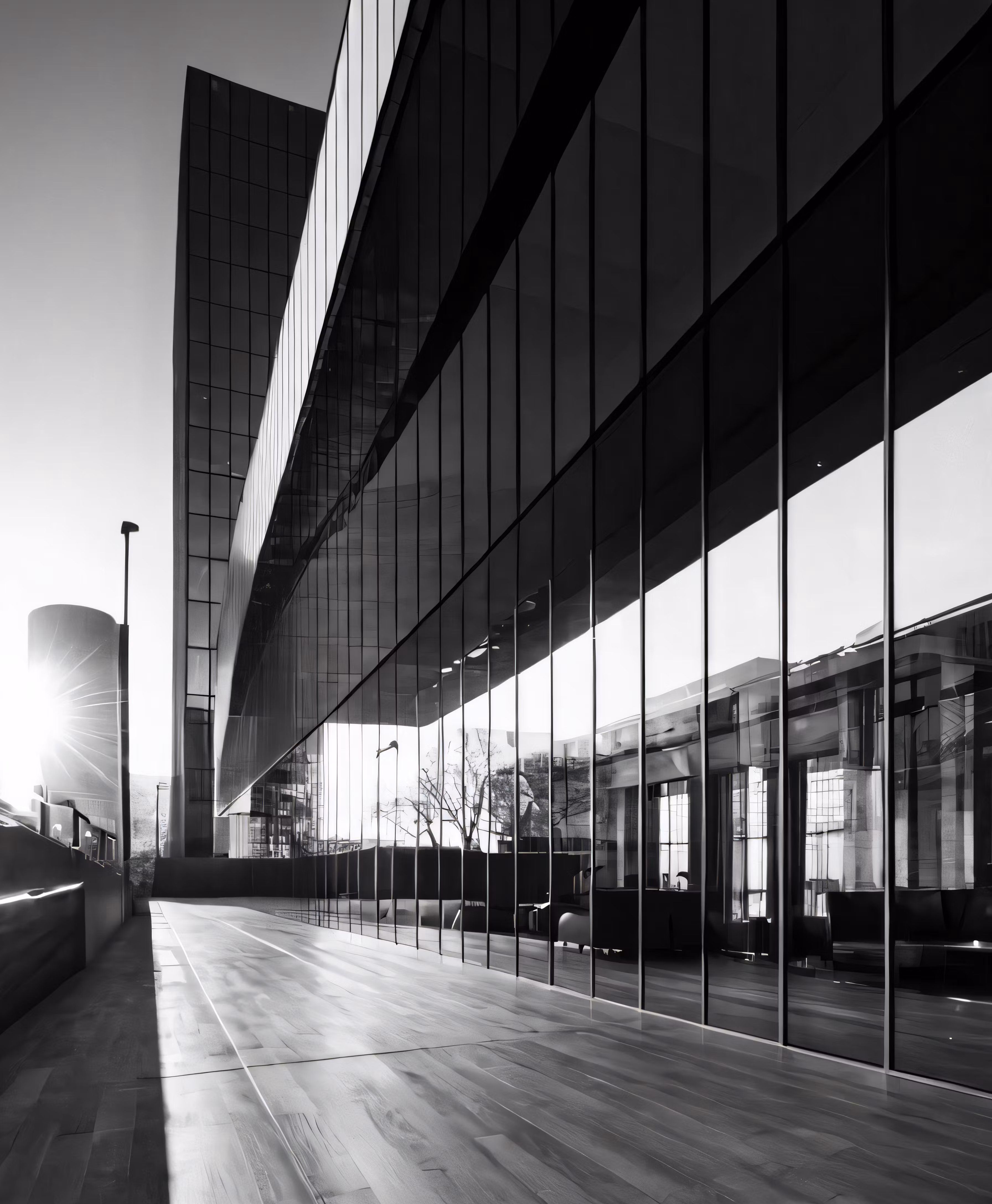 High resolution picture, free to use, a black and white photograph of an empty room in front of a building