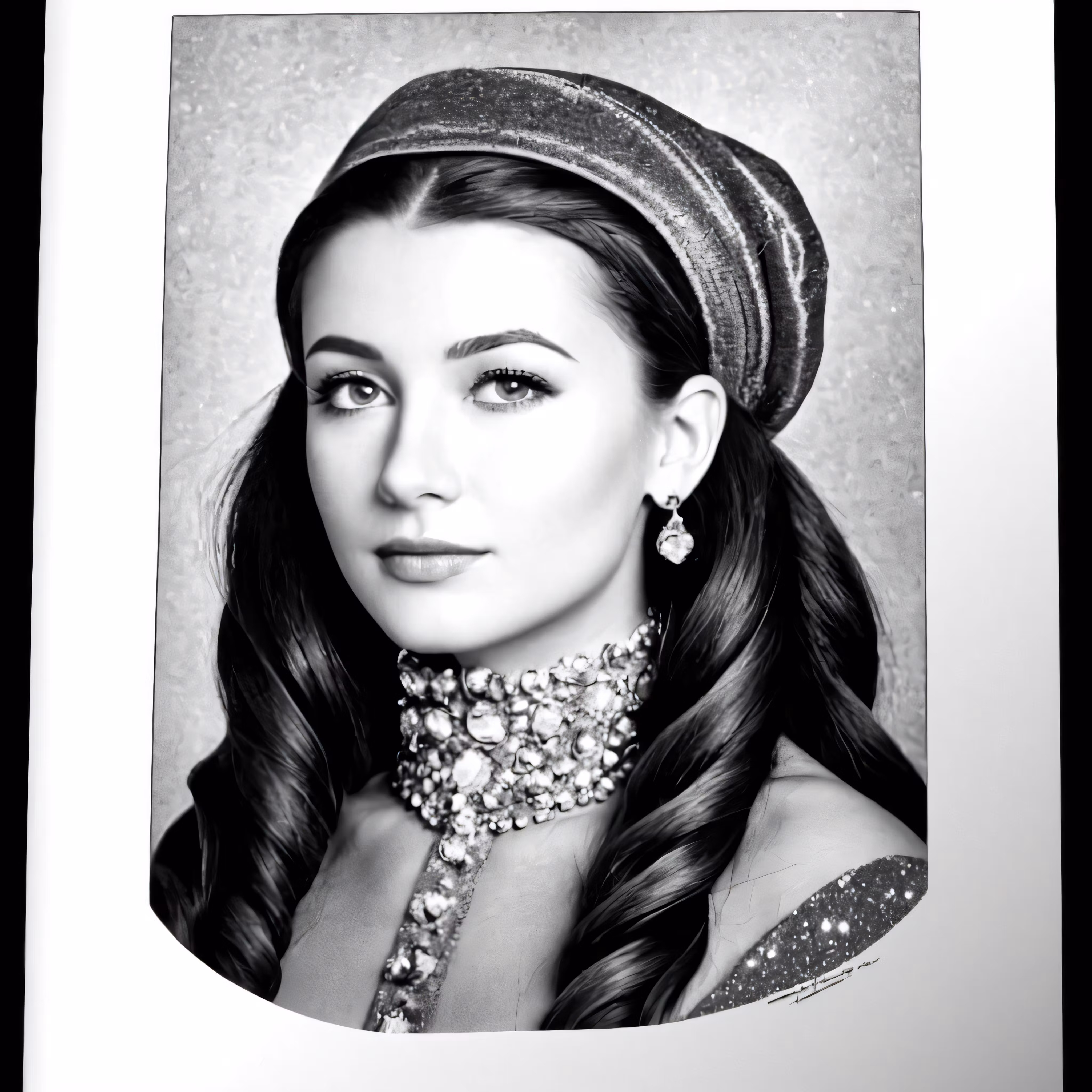 High resolution picture, free to use, a black and white portrait of a woman wearing a turban hat