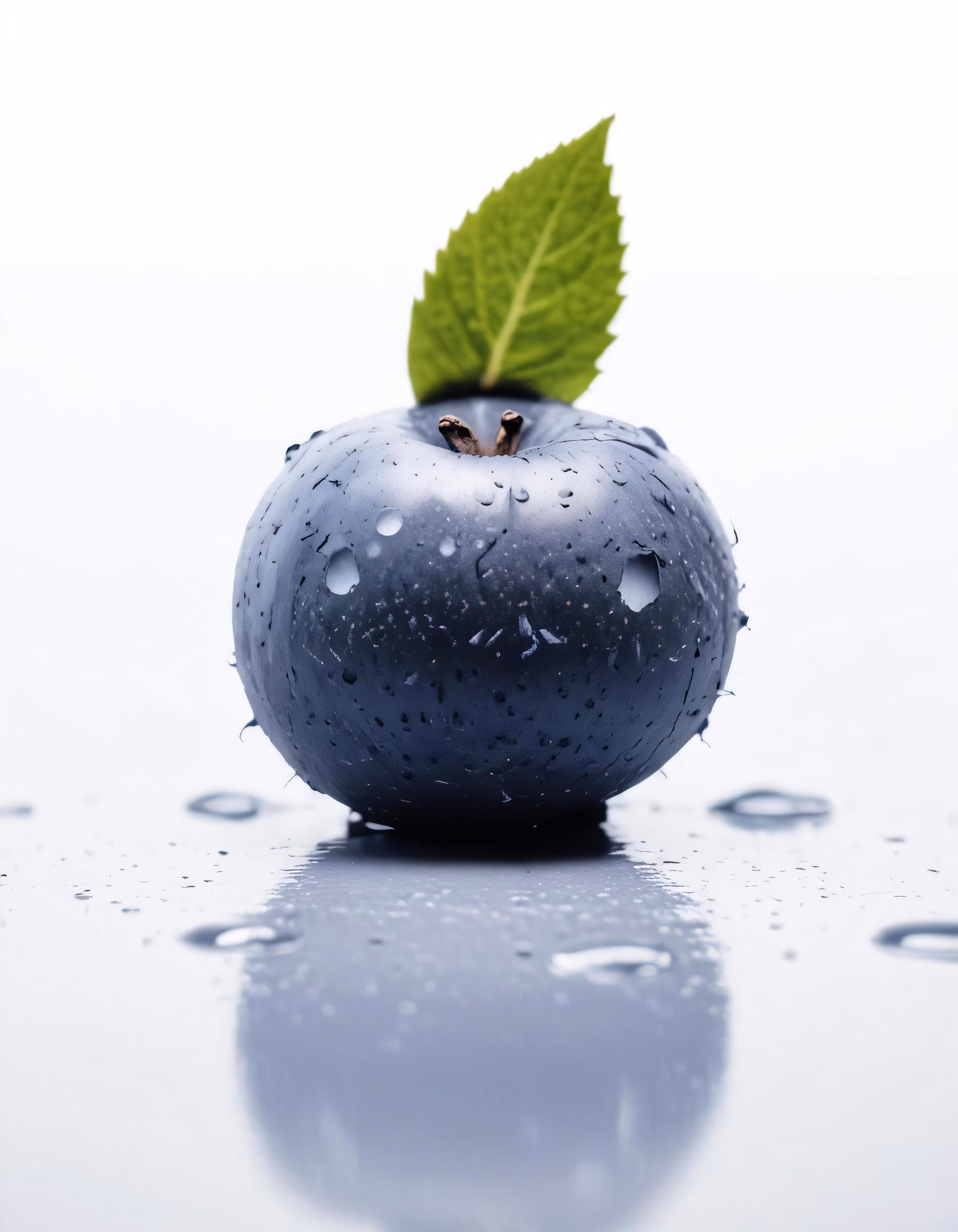 High resolution picture, free to use, a black apple with a leaf attached is sitting on a shiny surface
