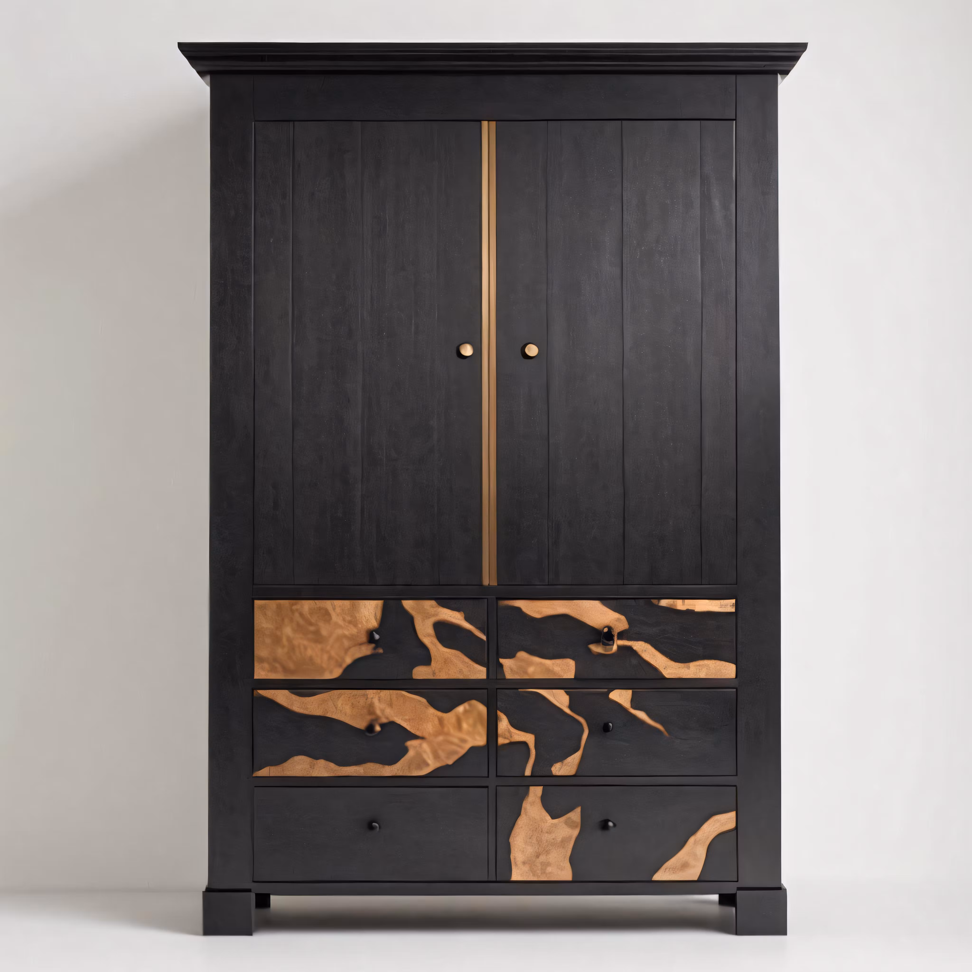 High resolution picture, free to use, a black cabinet with brown and gold panels