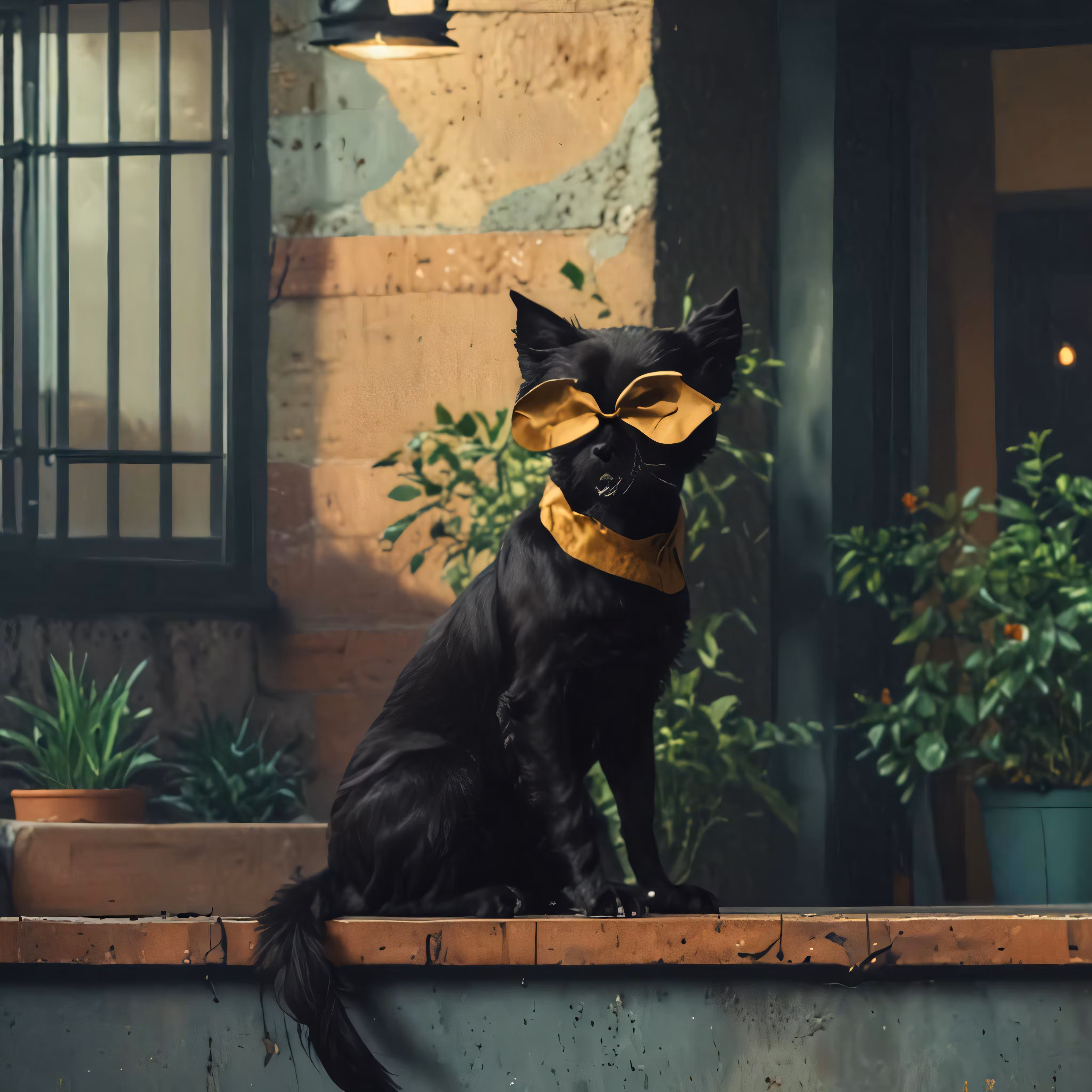 High resolution picture, free to use, a black cat wearing gold jewelry and wearing a costume