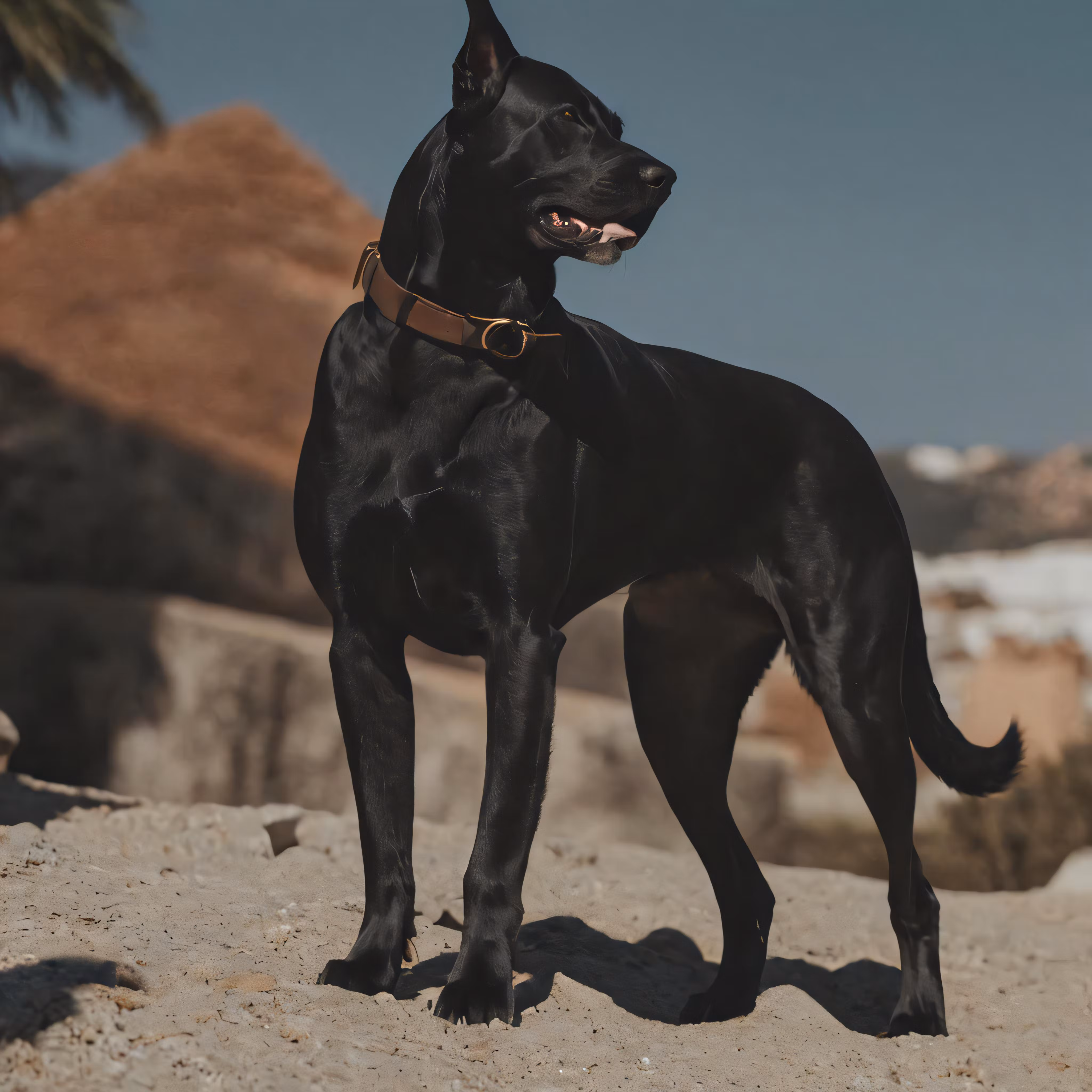 High resolution picture, free to use, a black dog is posing for a photo on the beach