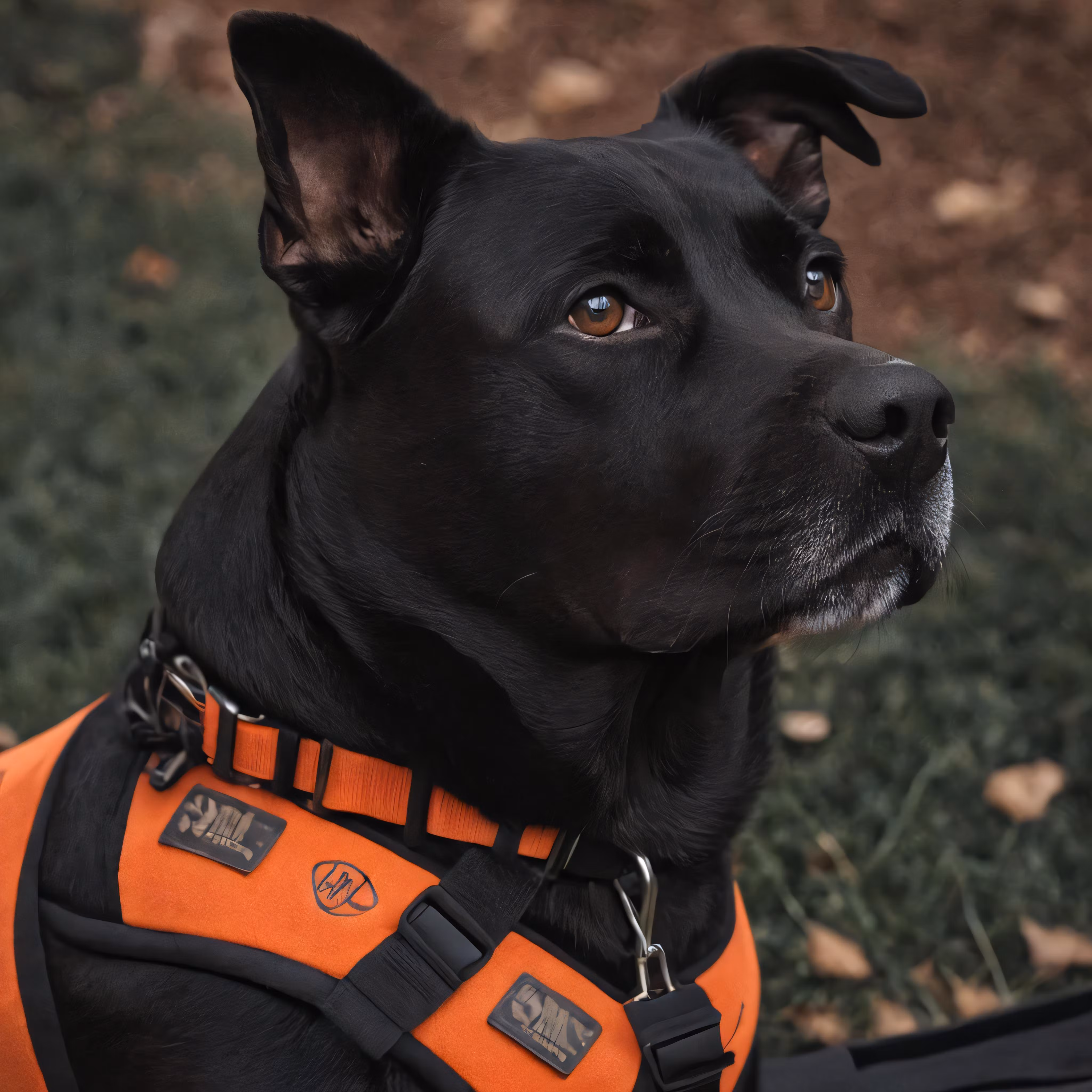 High resolution picture, free to use, a black dog wearing an orange vest on a grassy area