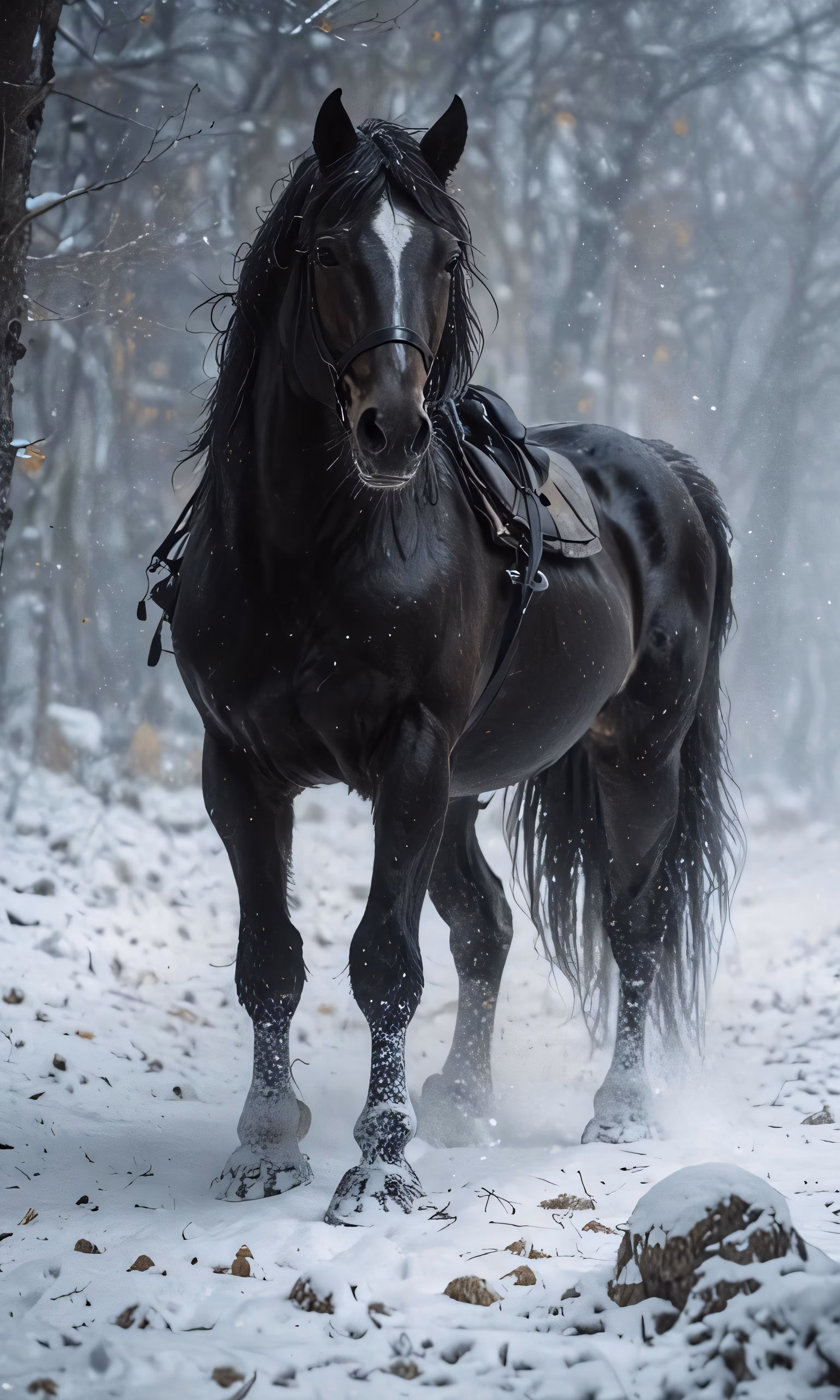 High resolution picture, free to use, a black horse walking on top of a snow covered ground