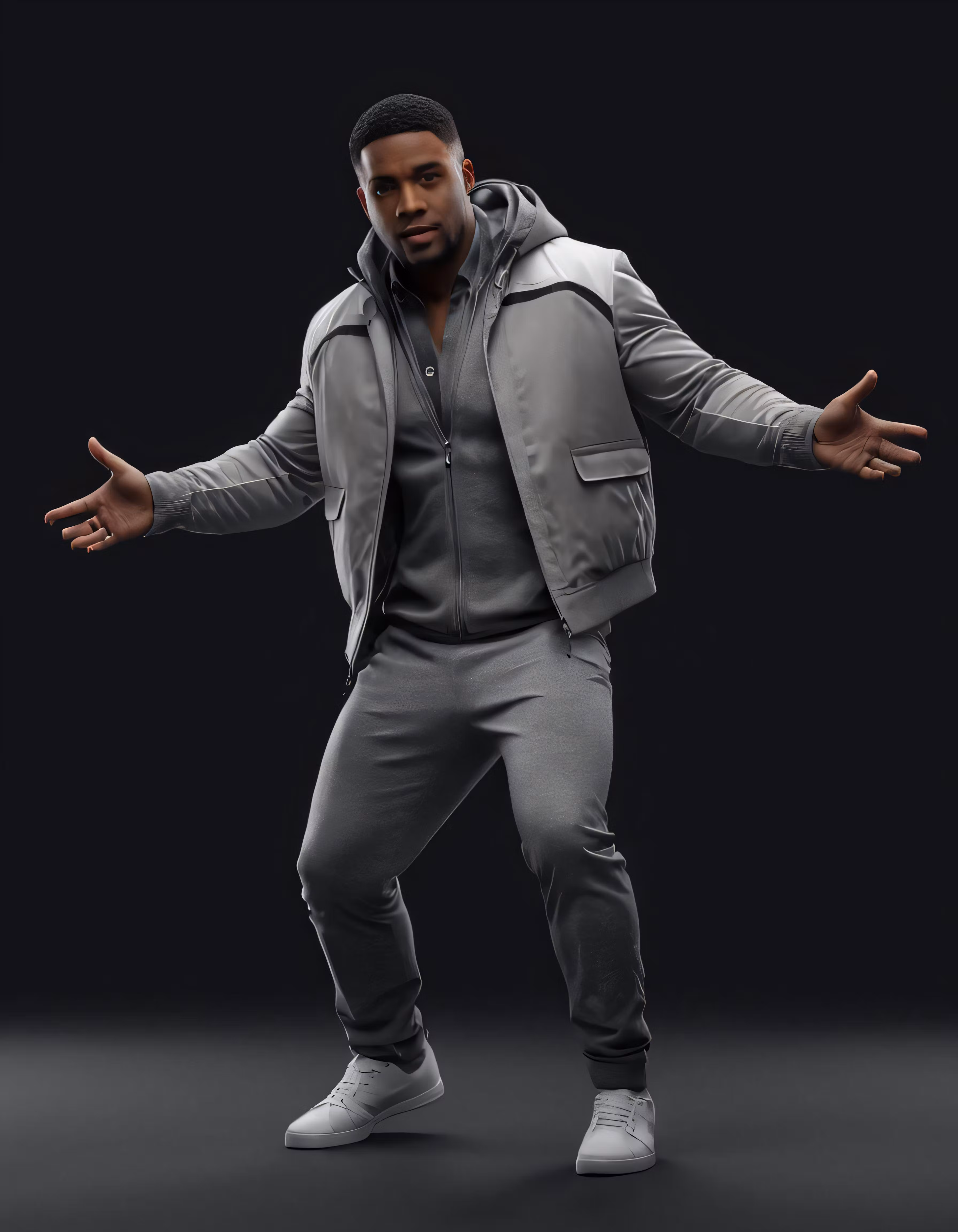 High resolution picture, free to use, a black man wearing a grey sweatshirt and pants, with his arms spread out