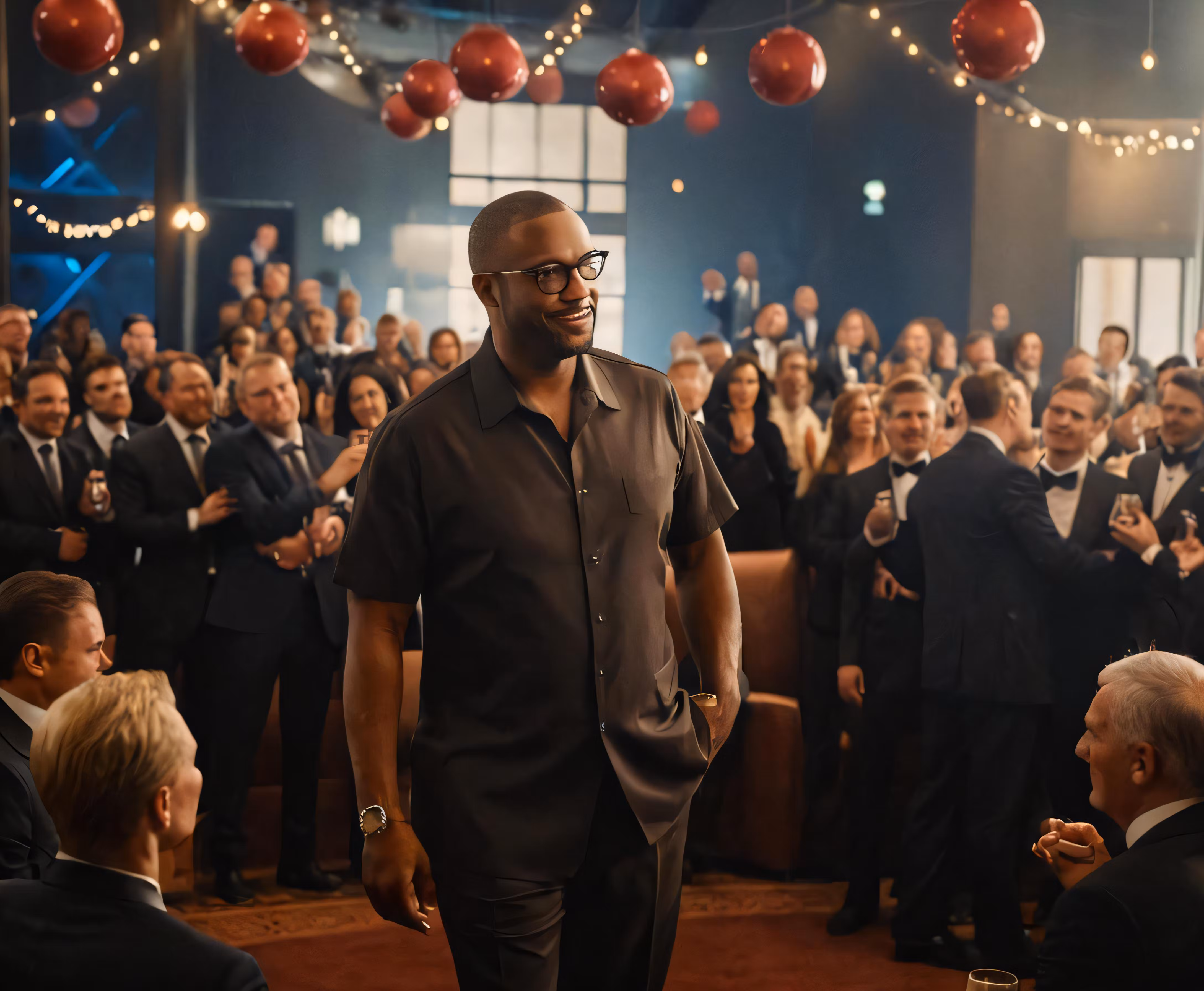 High resolution picture, free to use, a black man wearing glasses standing in front of a group of people