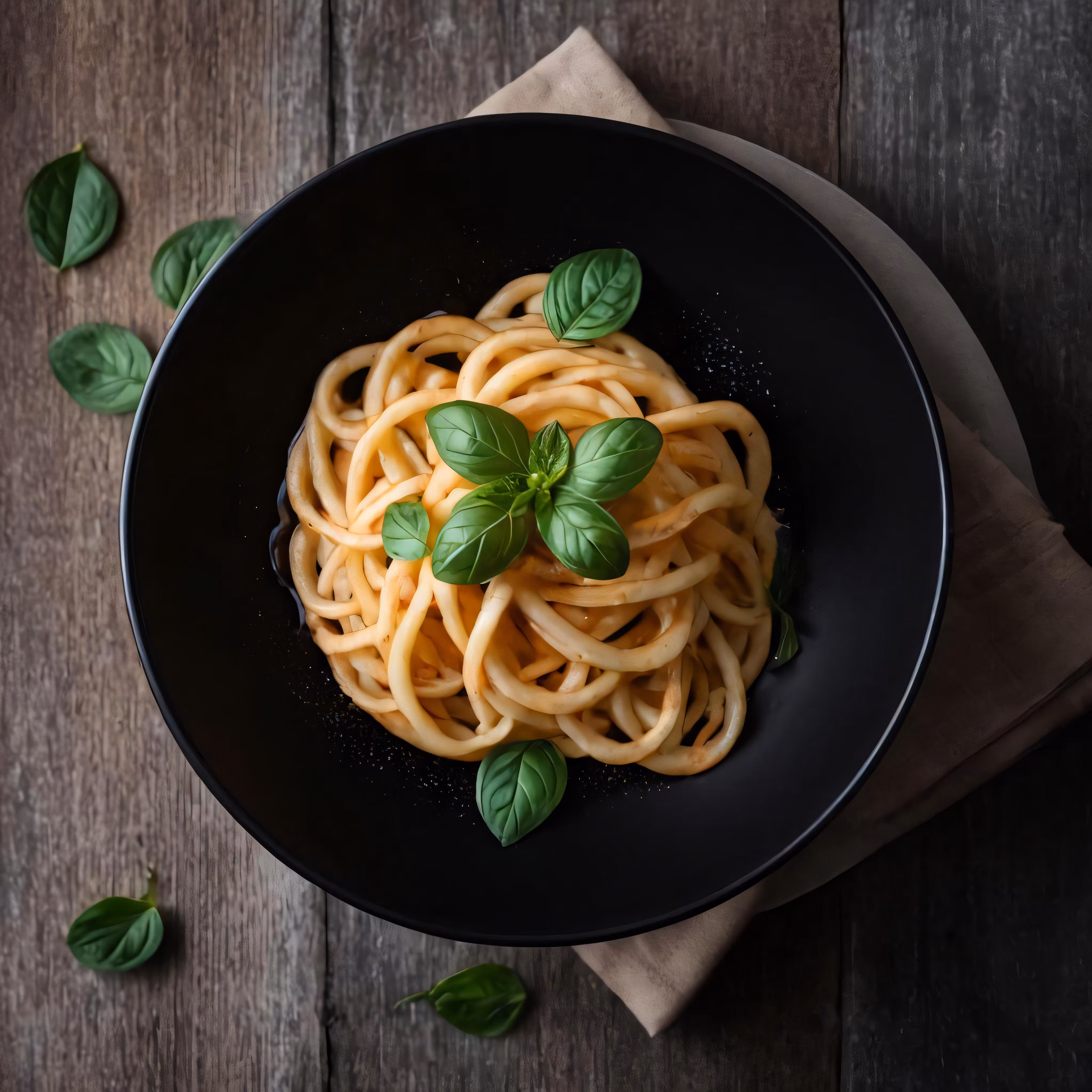 High resolution picture, free to use, a black plate filled with pasta and herbs