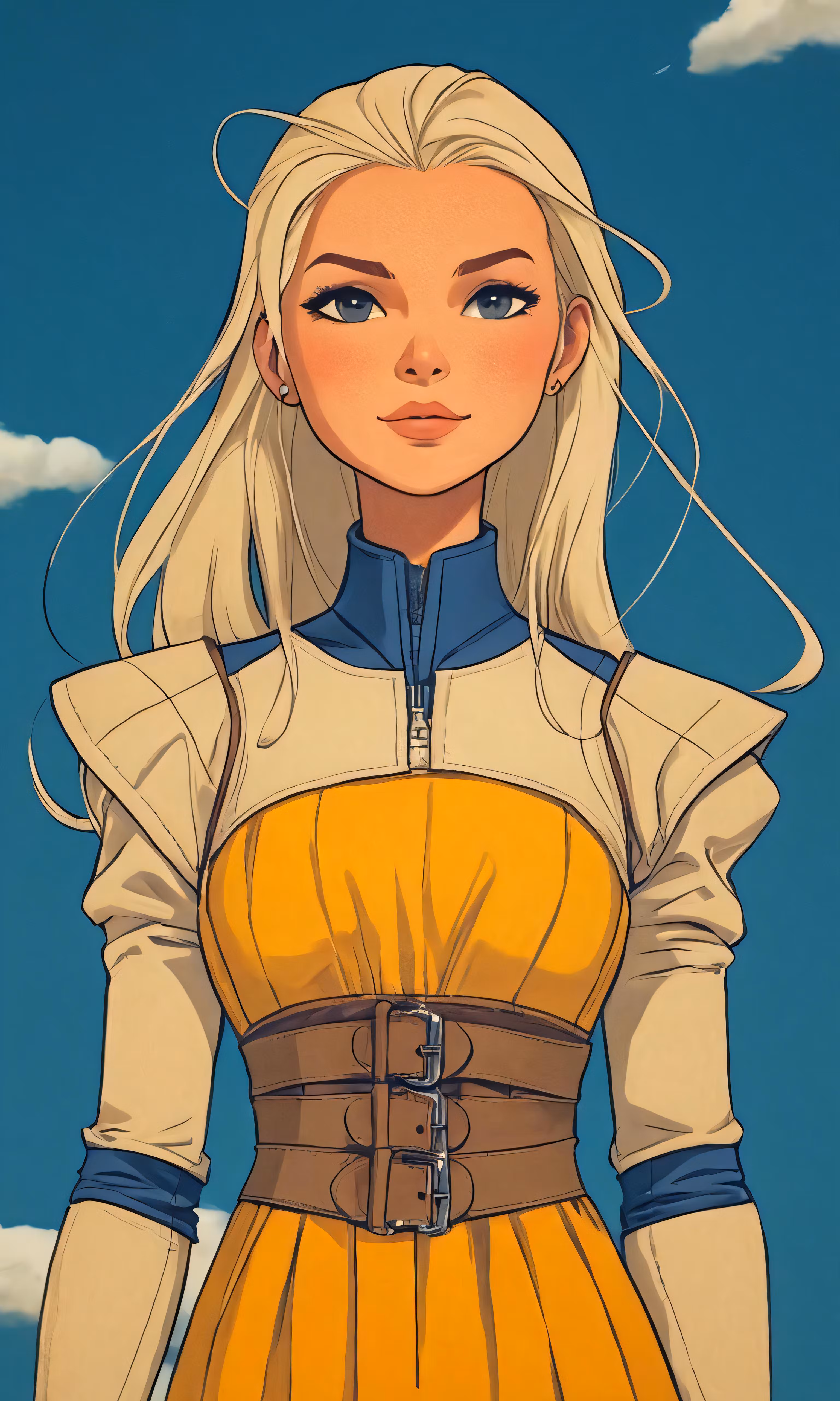 High resolution picture, free to use, a blonde female with long hair and blue eyes in a yellow dress