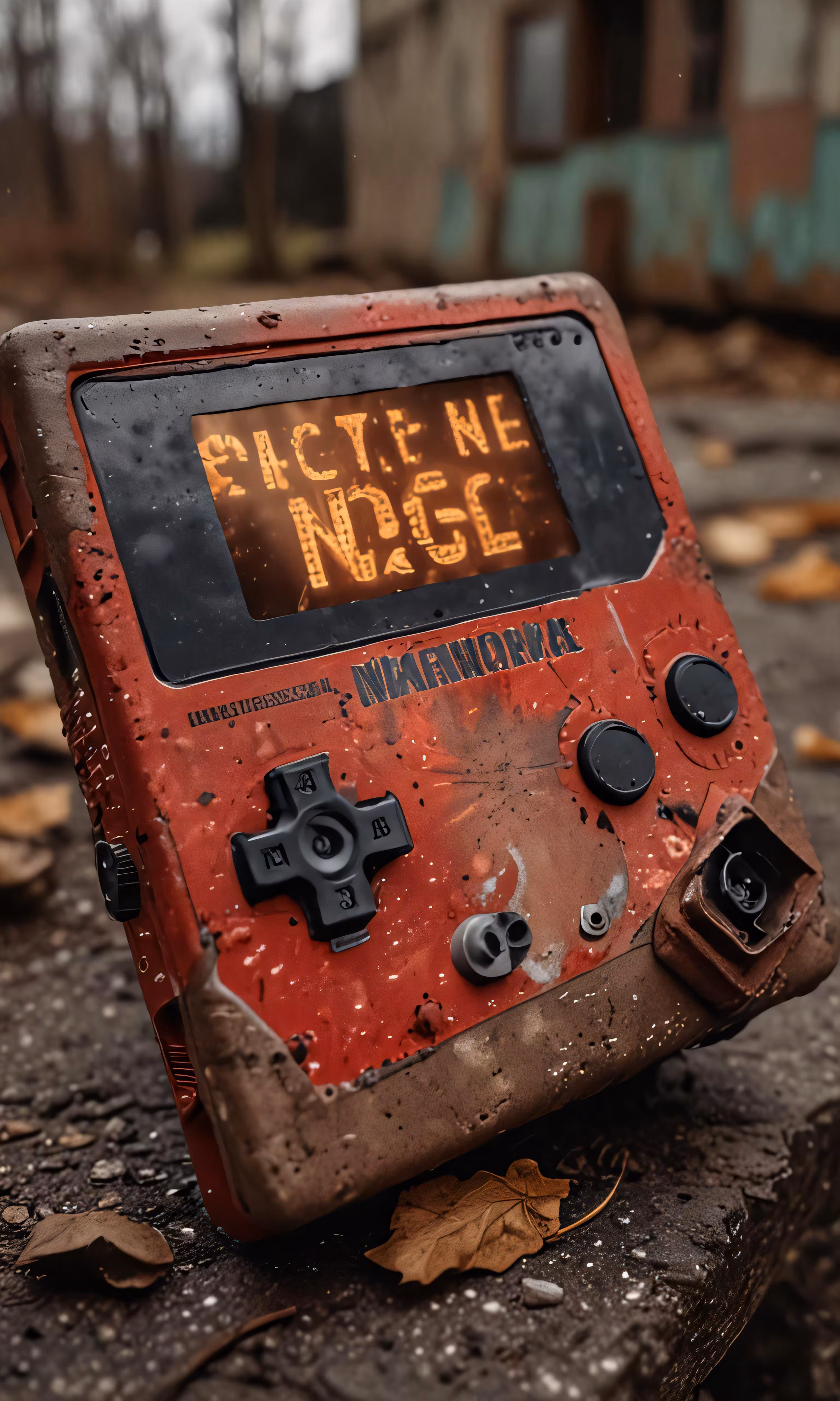 High resolution picture, free to use, a blood covered gameboy sitting on top of a tree stump