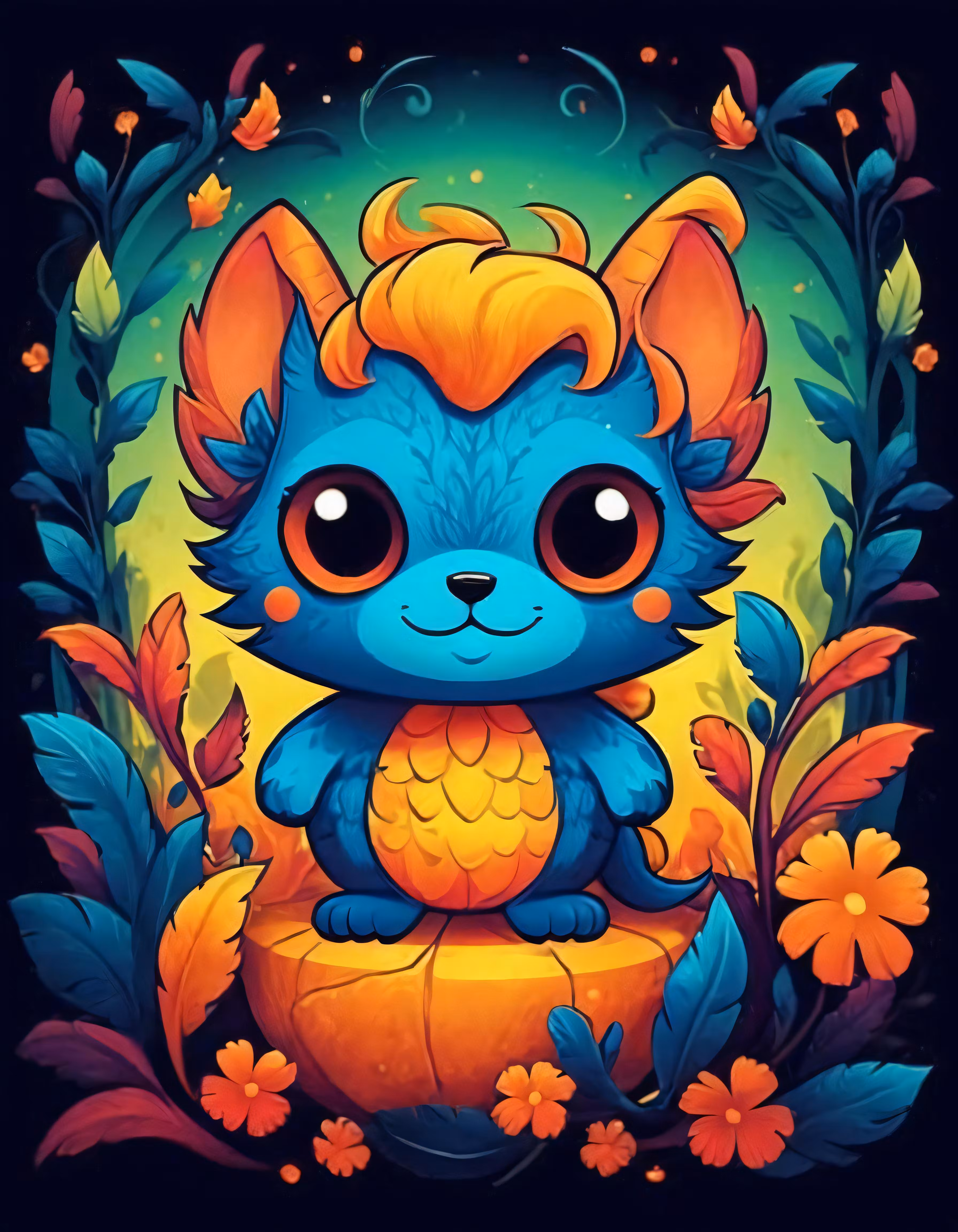 High resolution picture, free to use, a blue and orange painting of an adorable animal sitting in a flower frame