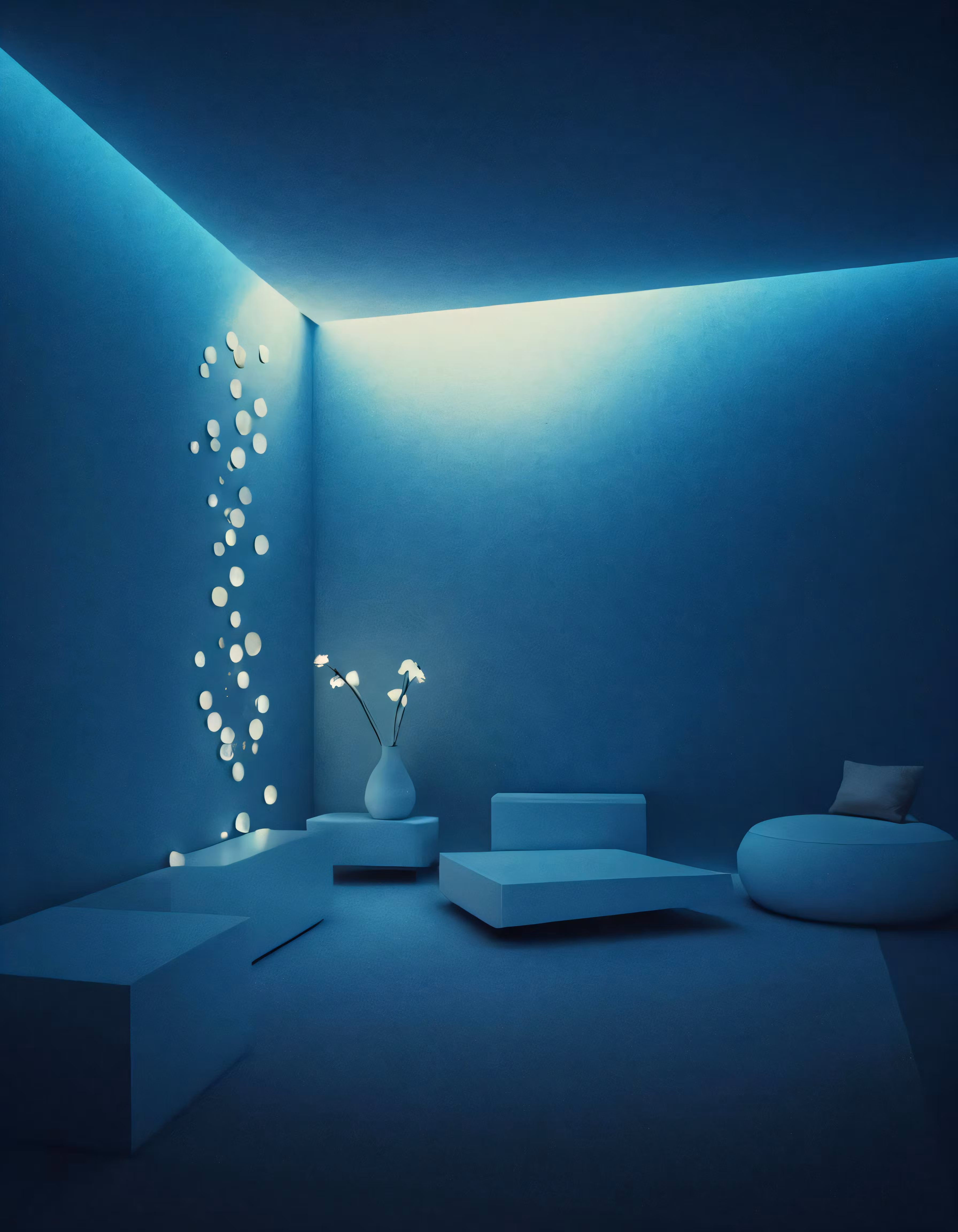 High resolution picture, free to use, a blue and white room with furniture and lights