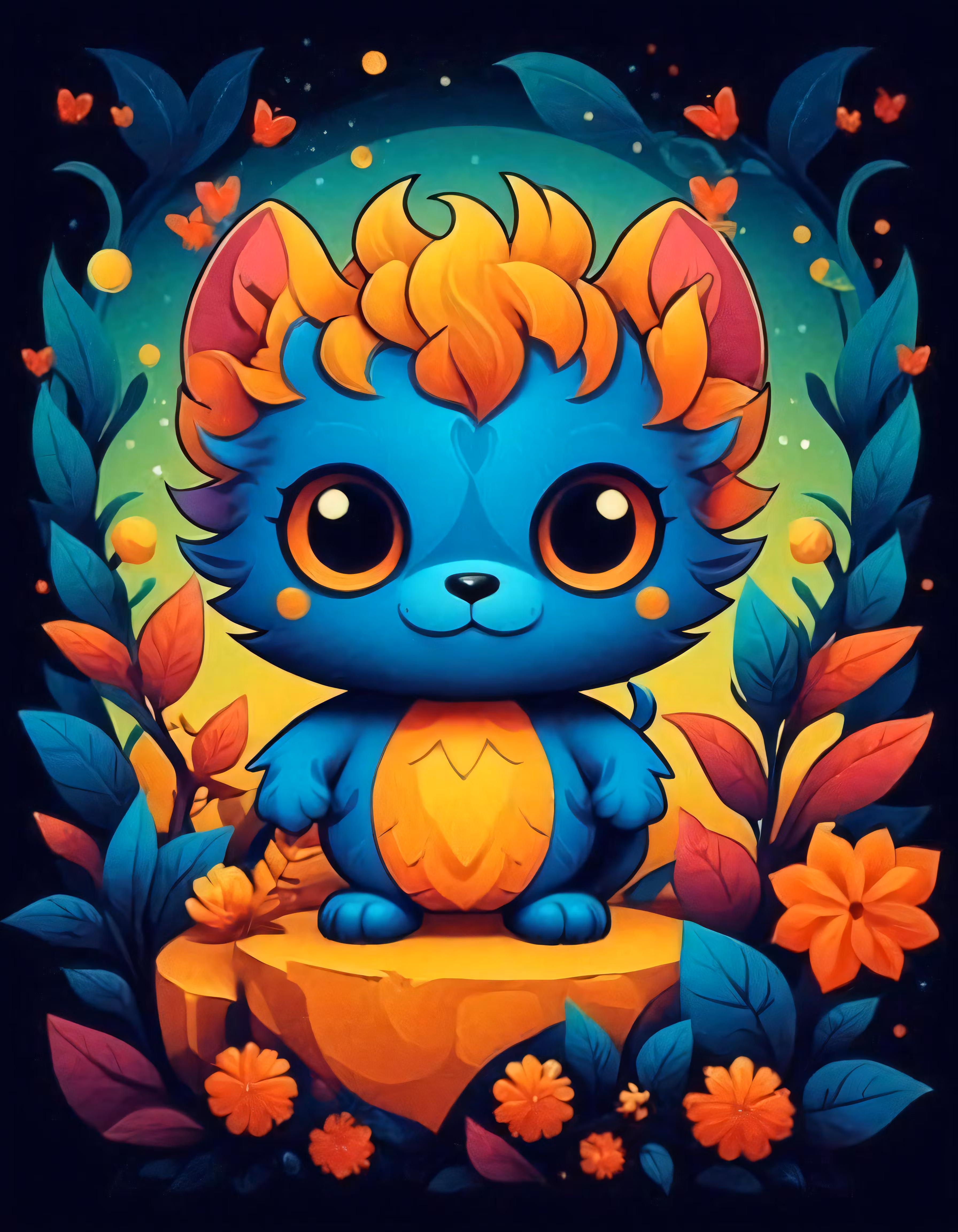 High resolution picture, free to use, a blue and yellow furry animal sitting on top of a flower pot