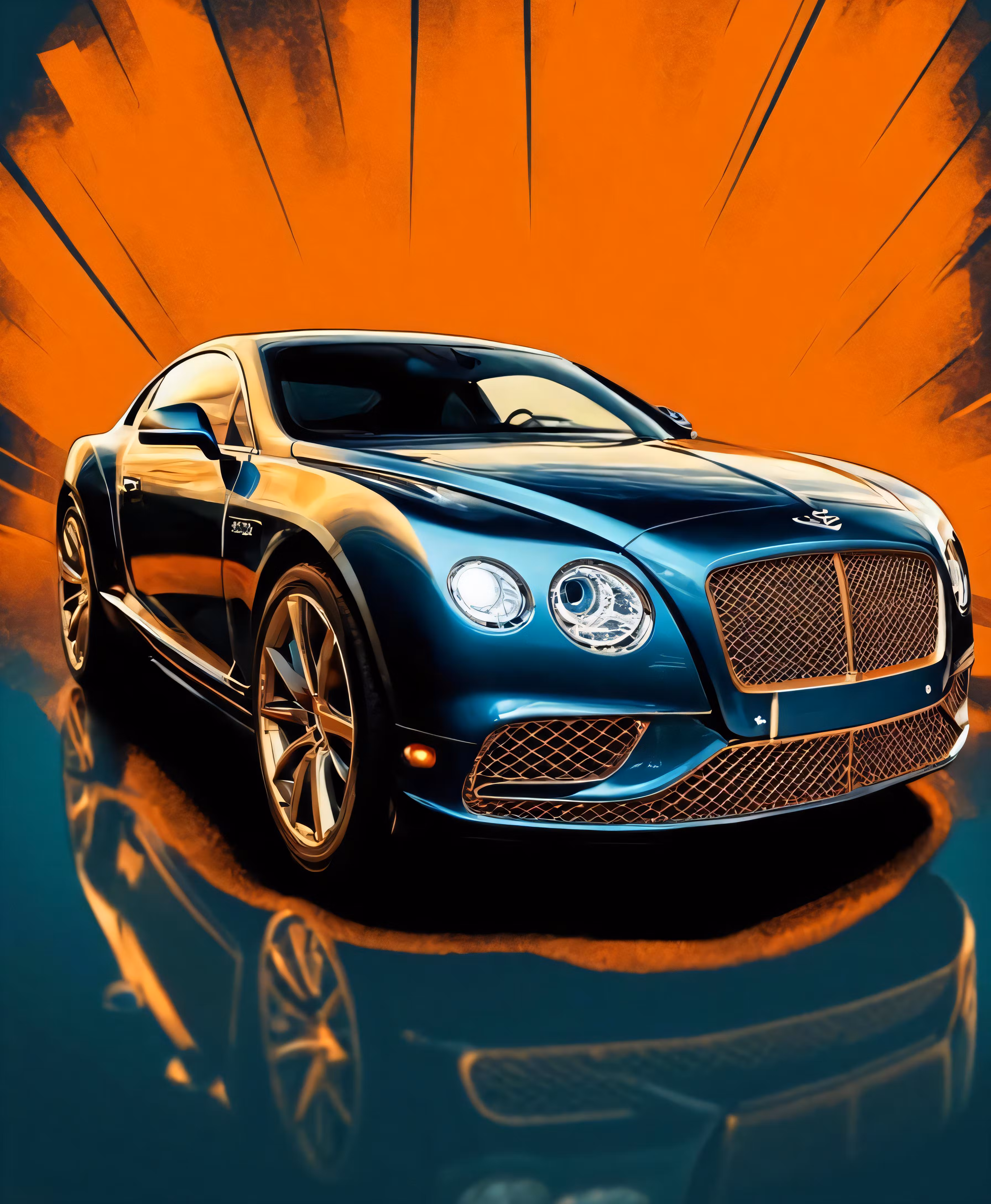 High resolution picture, free to use, a blue bentley sports car is shown against an orange background