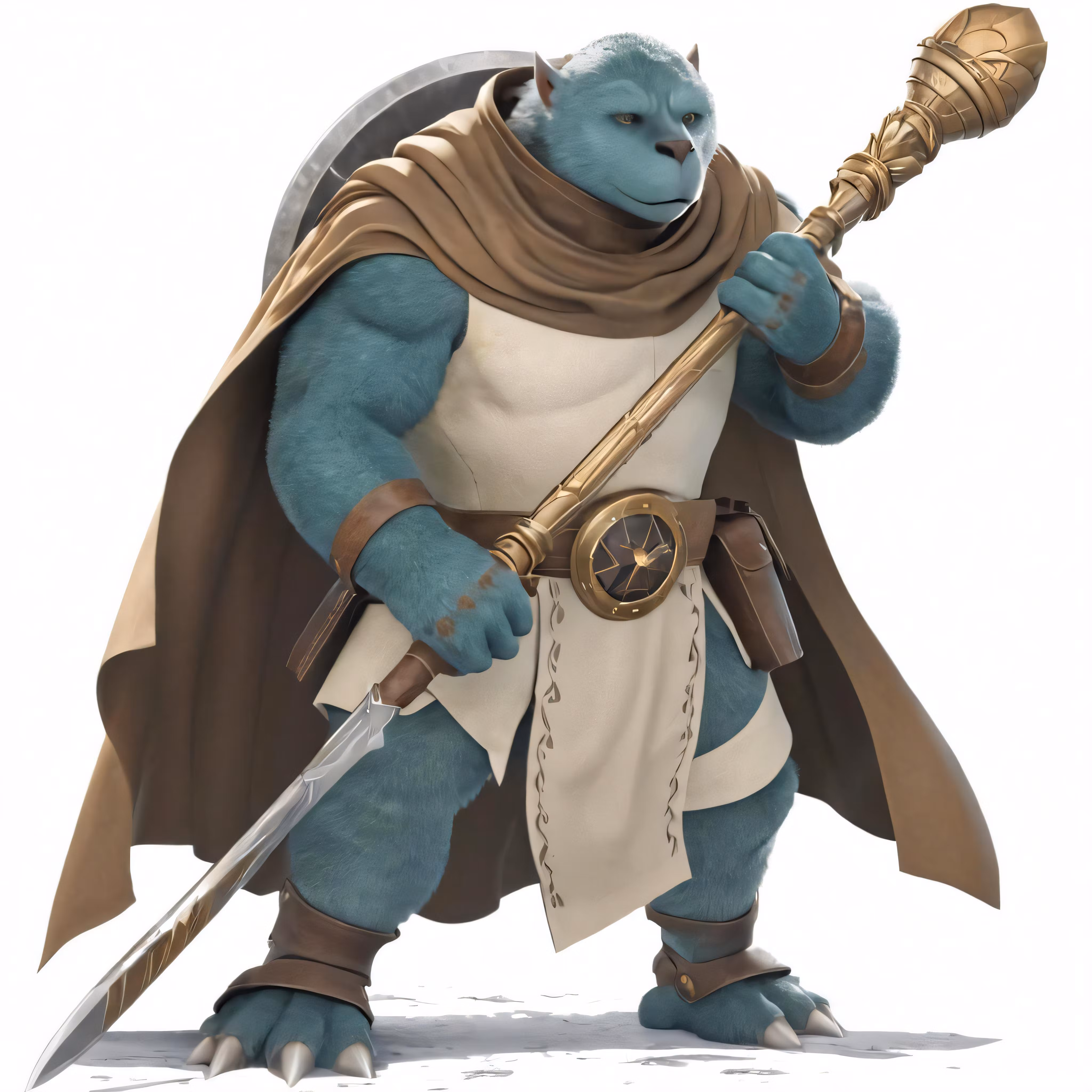 High resolution picture, free to use, a blue creature wearing a horned warrior outfit with a sword