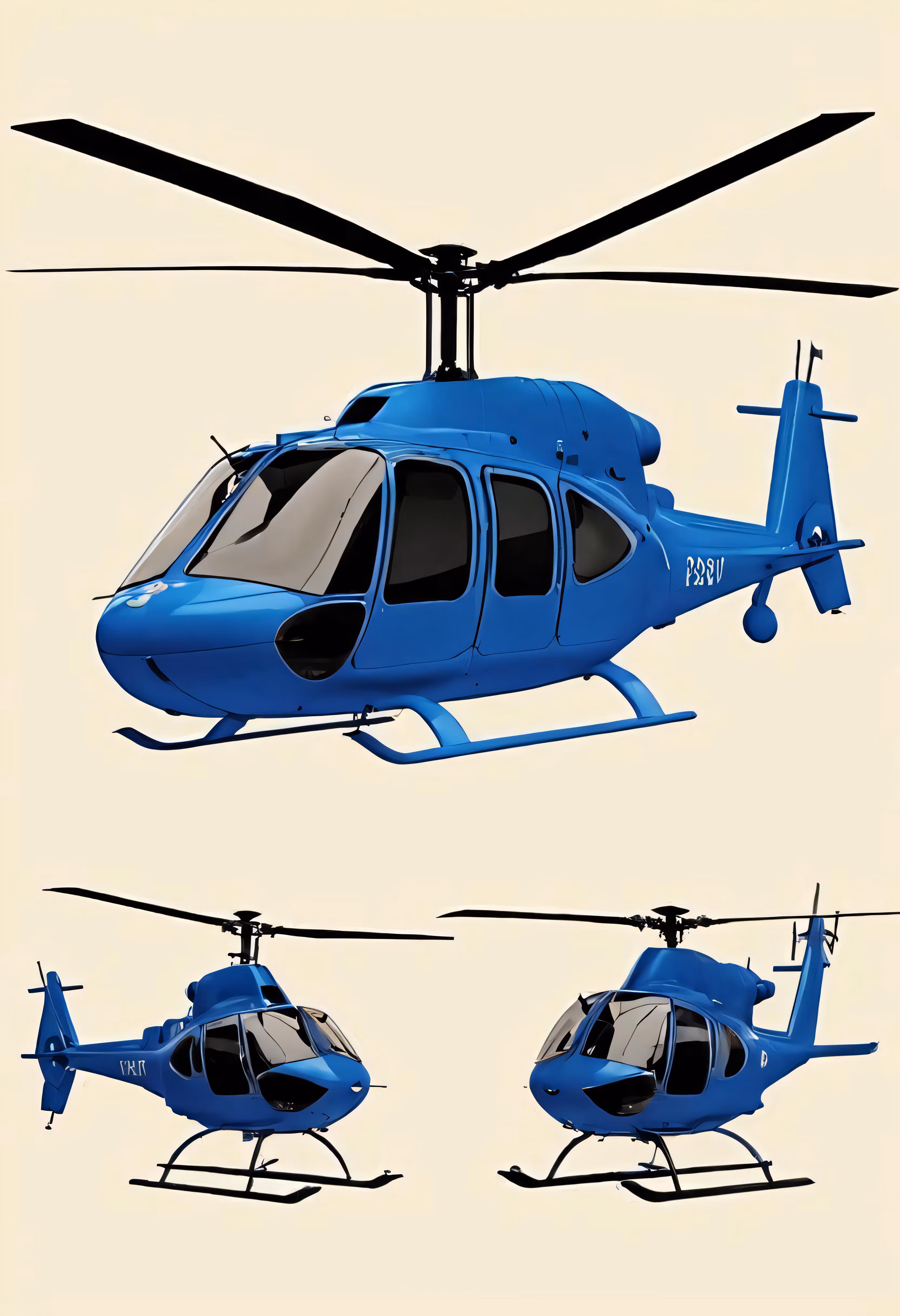 High resolution picture, free to use, a blue helicopter with four different positions on a white background