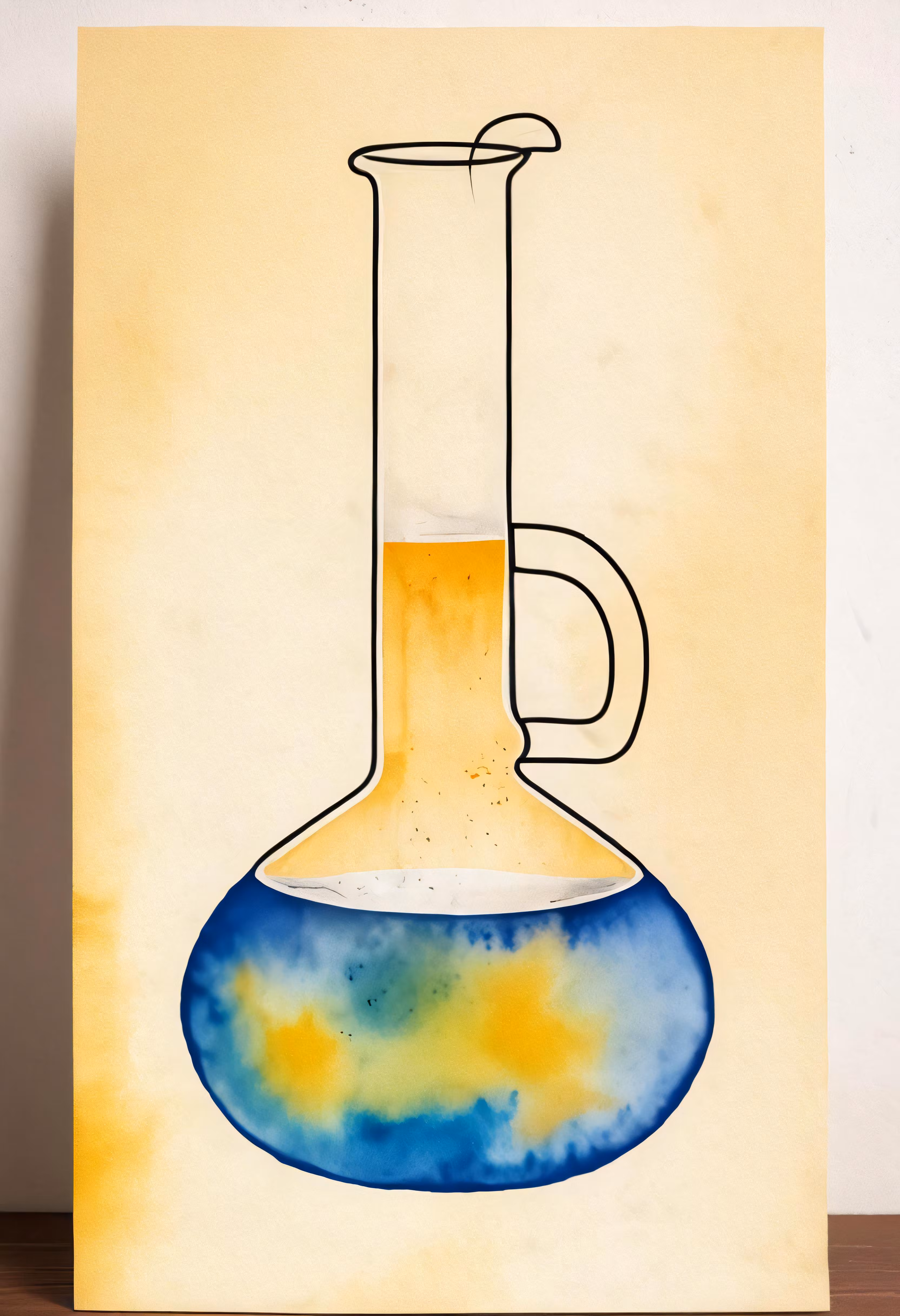 High resolution picture, free to use, a blue yellow and brown colored glass flask with a yellow bottom