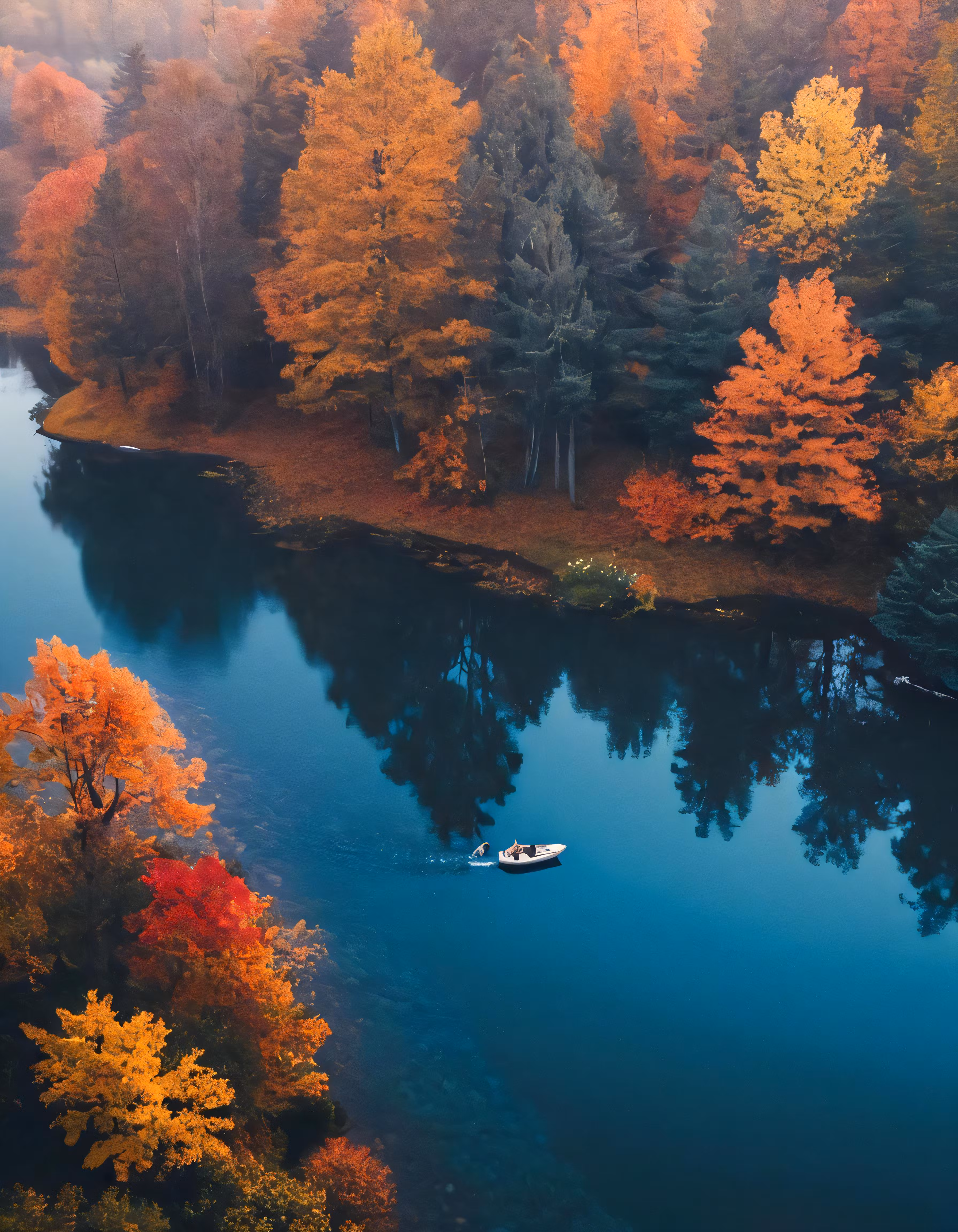 High resolution picture, free to use, a boat is out in the water surrounded by colorful autumn foliage