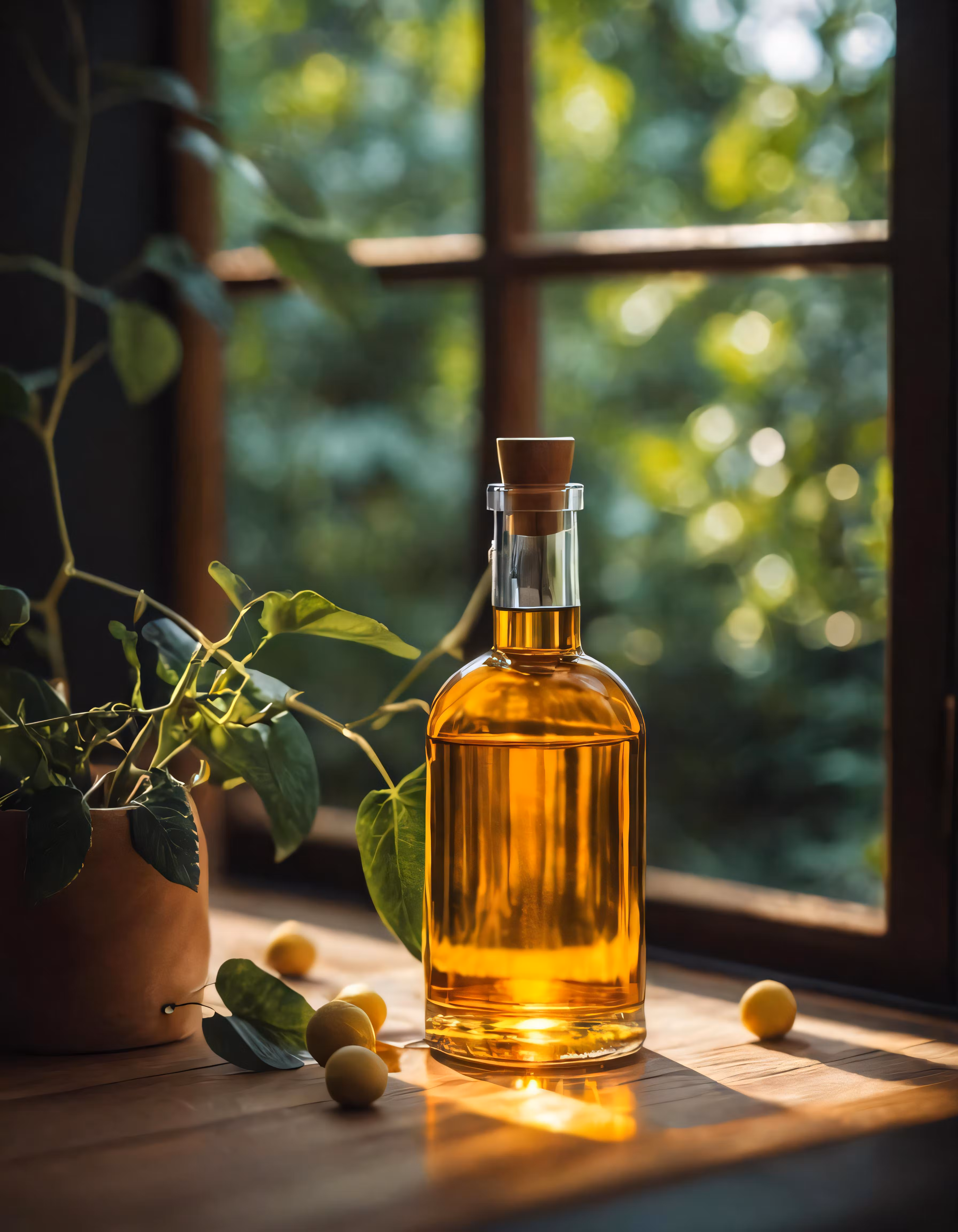 High resolution picture, free to use, a bottle of oil next to a potted plant on the window sill