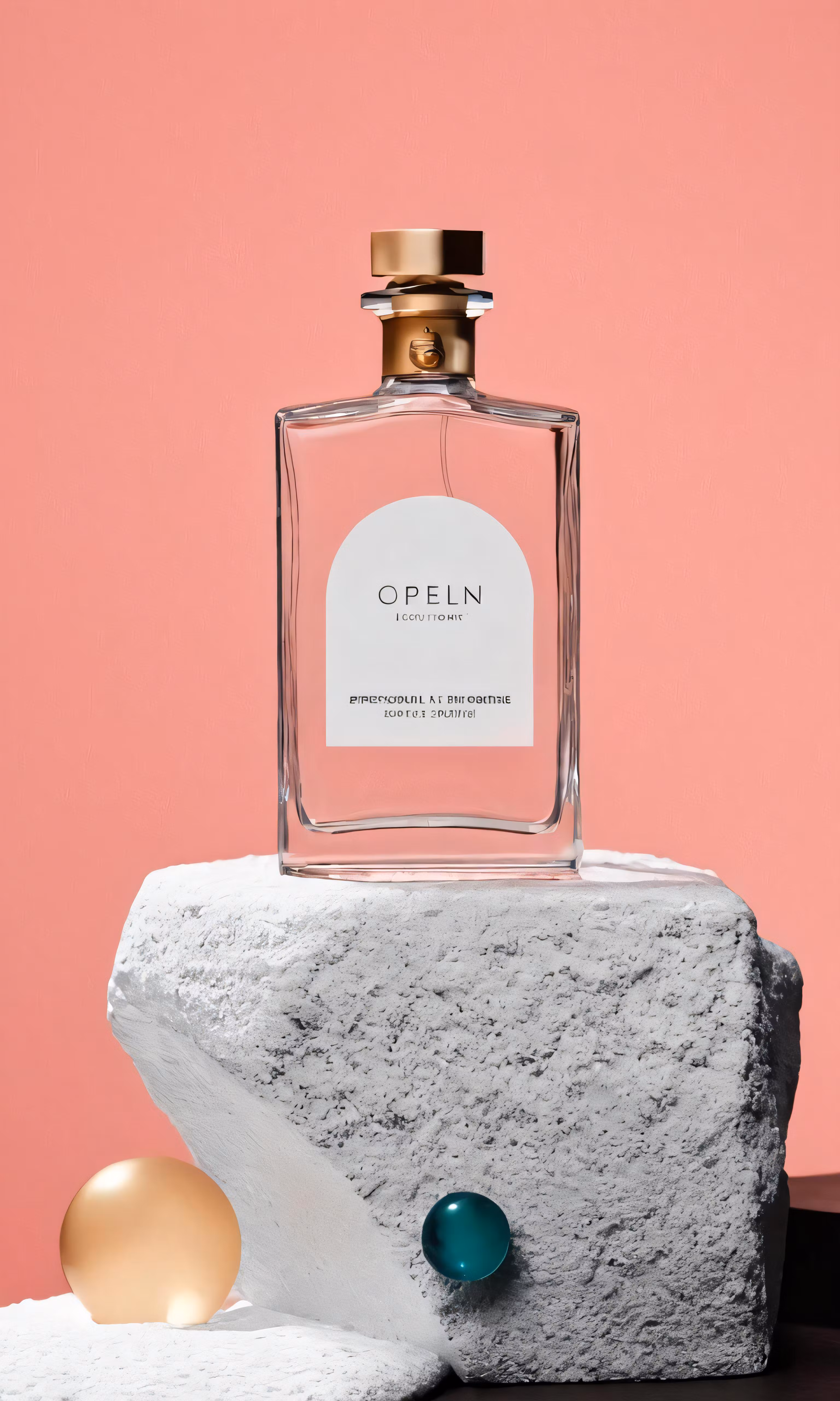 High resolution picture, free to use, a bottle of perfume sitting on top of a rock