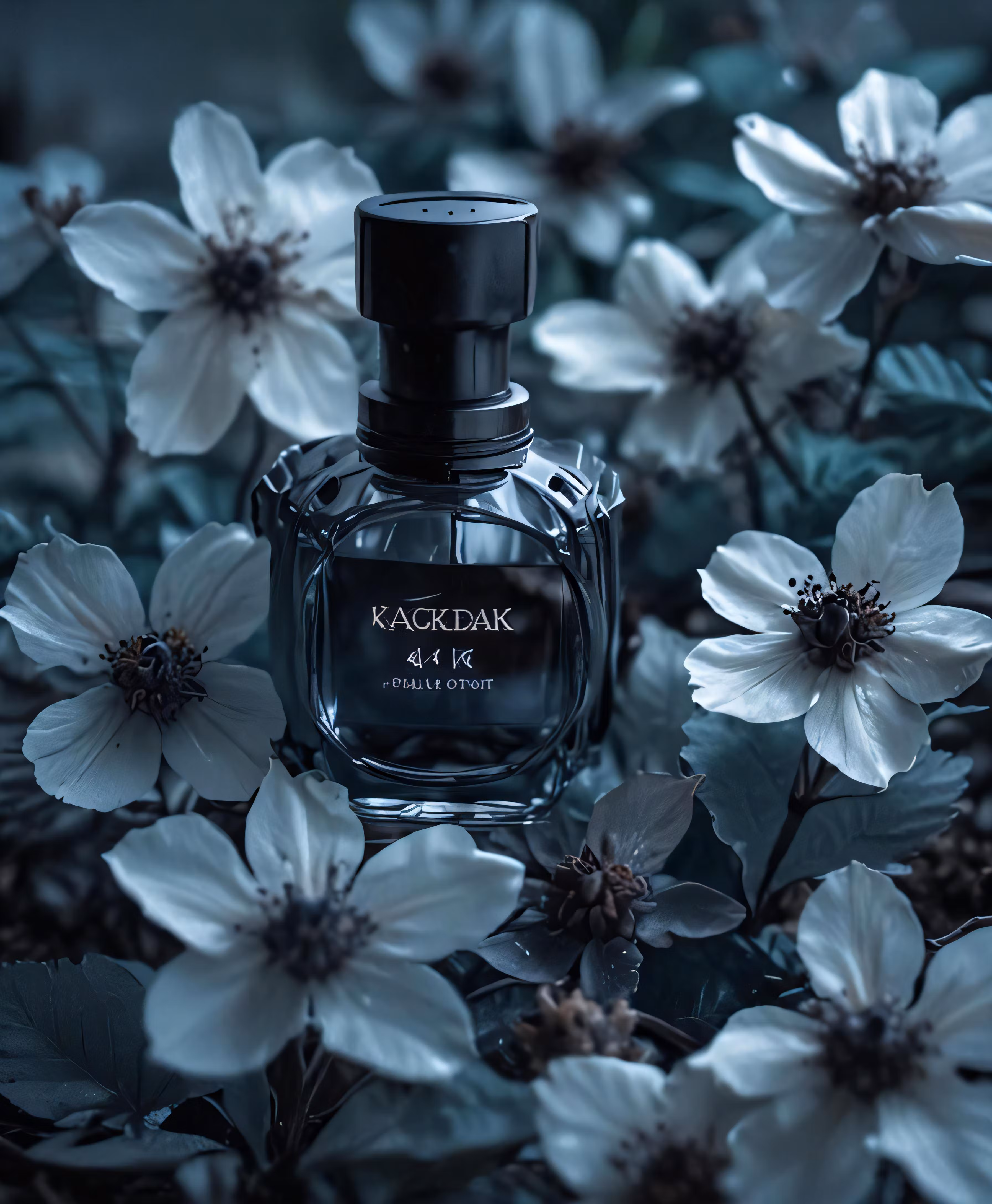 High resolution picture, free to use, a bottle of perfume surrounded by flowery bushes