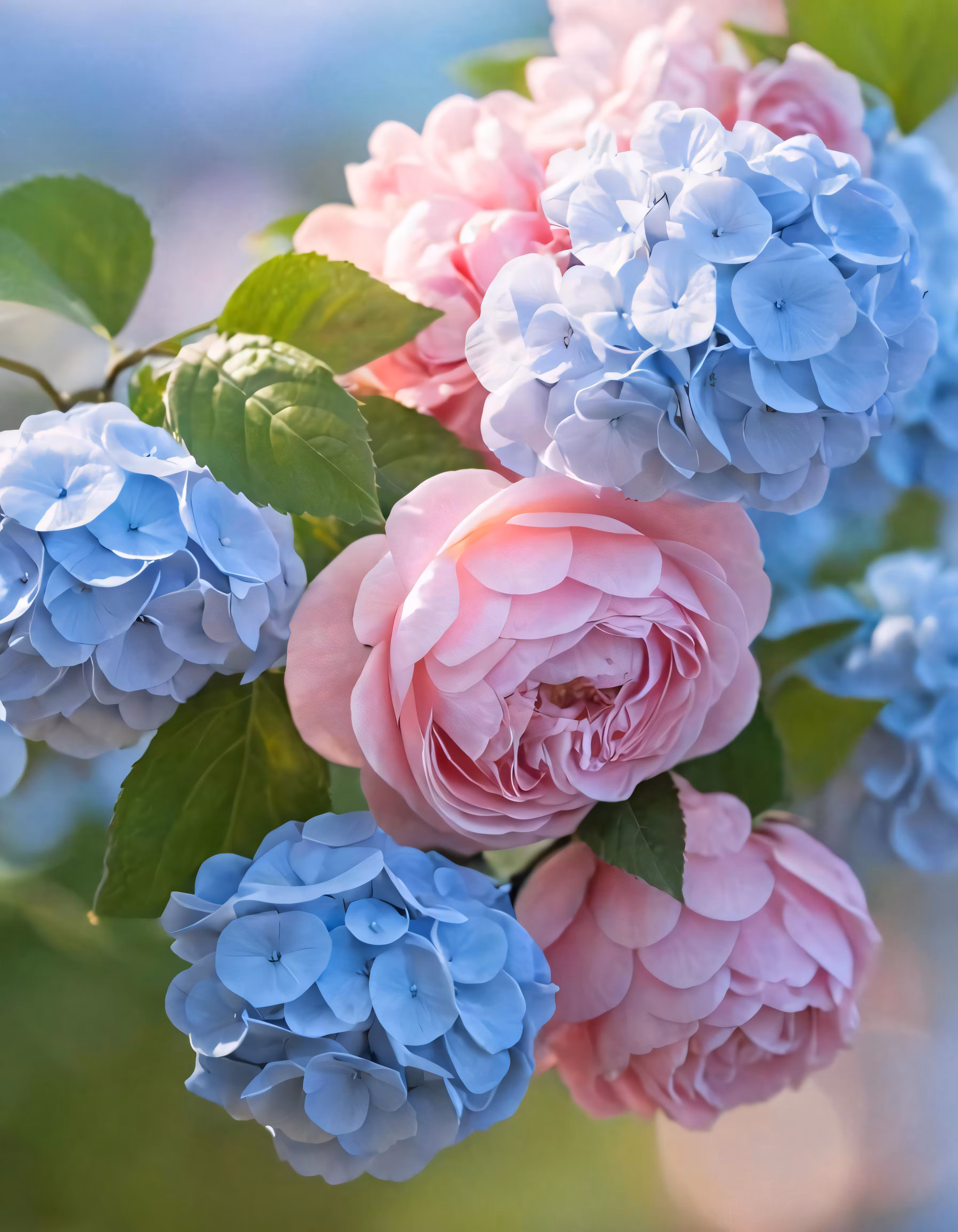 High resolution picture, free to use, a bouquet of blue and pink flowers, with leaves
