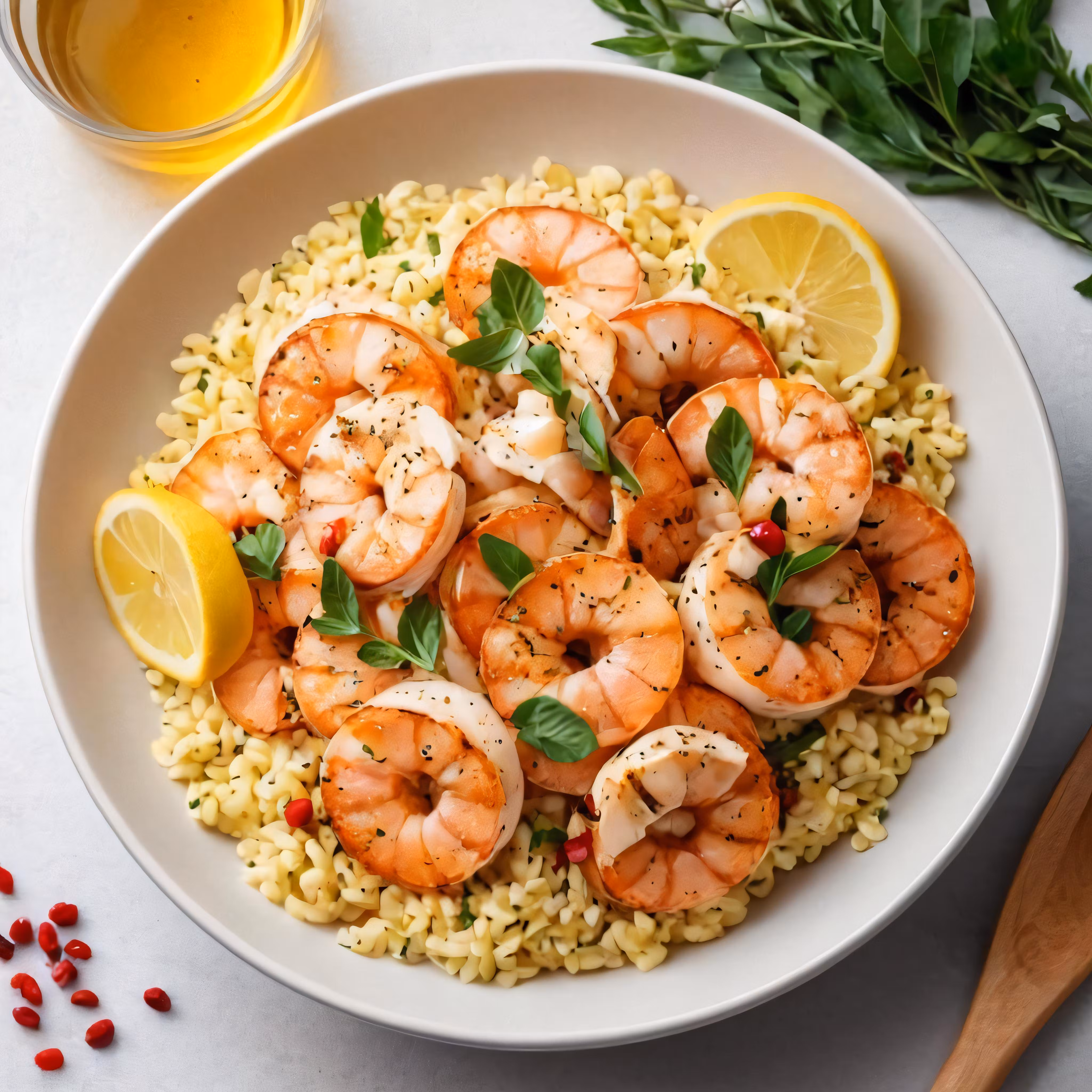 High resolution picture, free to use, a bowl filled with rice topped with shrimp and parsley