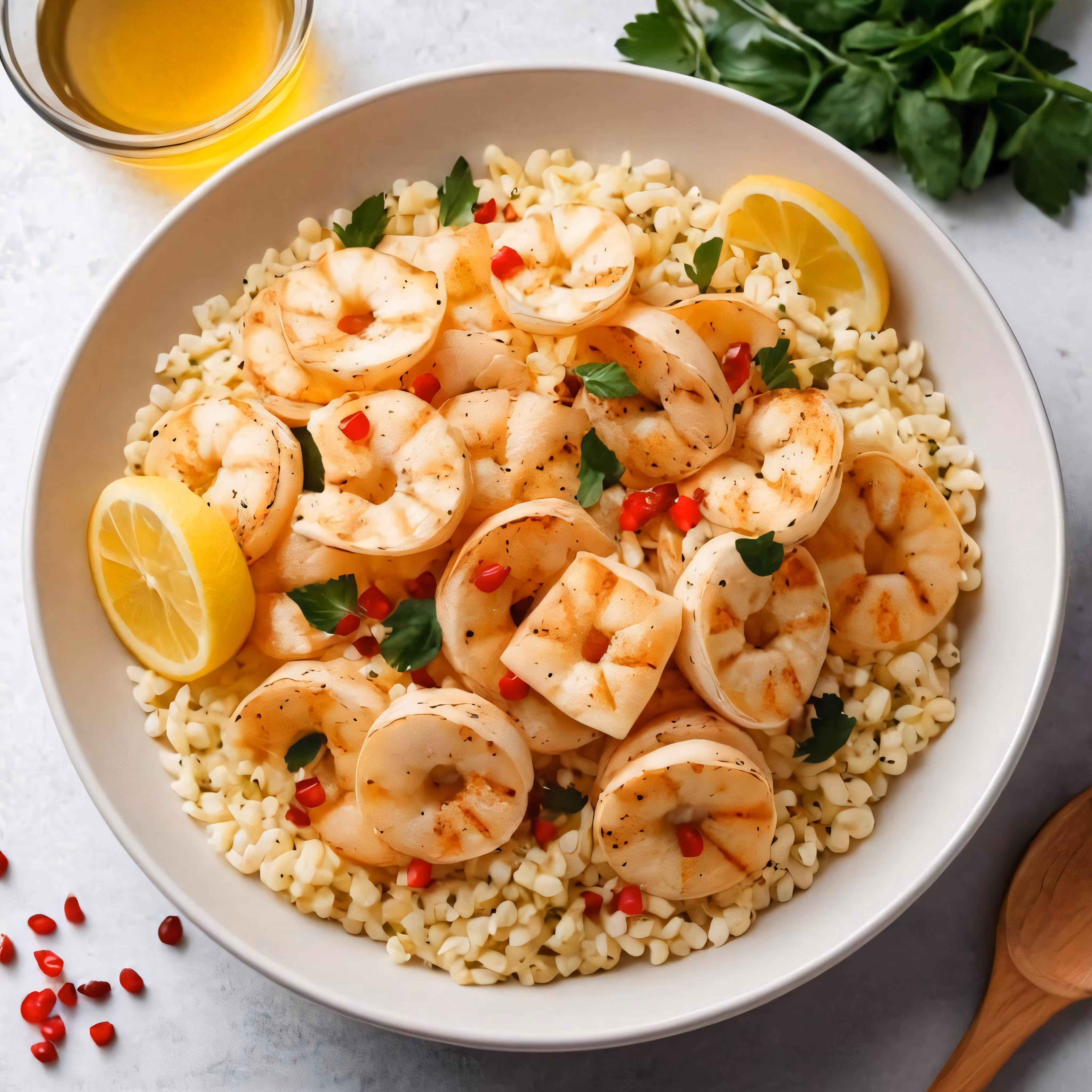 High resolution picture, free to use, a bowl of shrimp, parsley, and rice with a lemon slice and cilantro