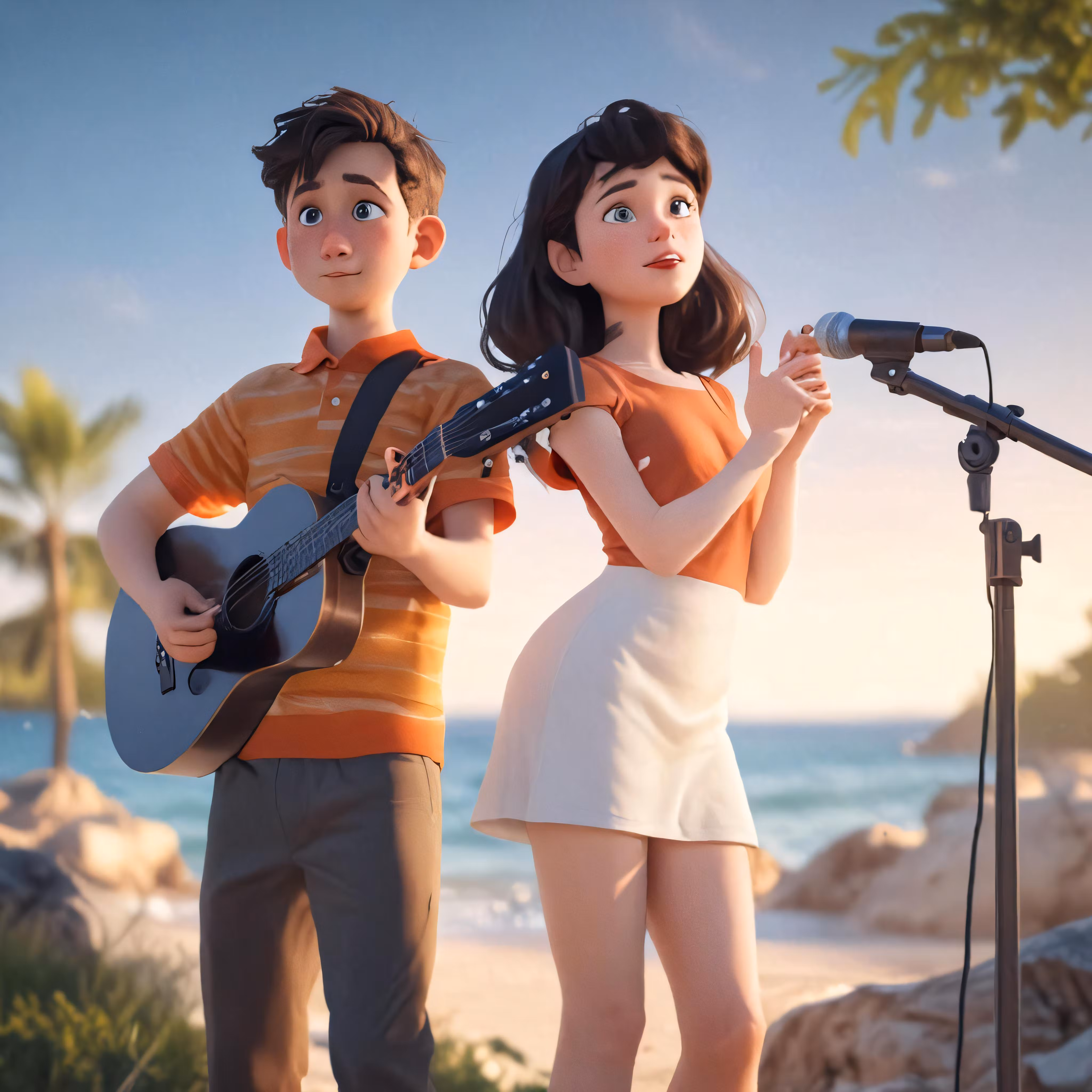 High resolution picture, free to use, a boy and girl singing into microphones while the girl plays the guitar