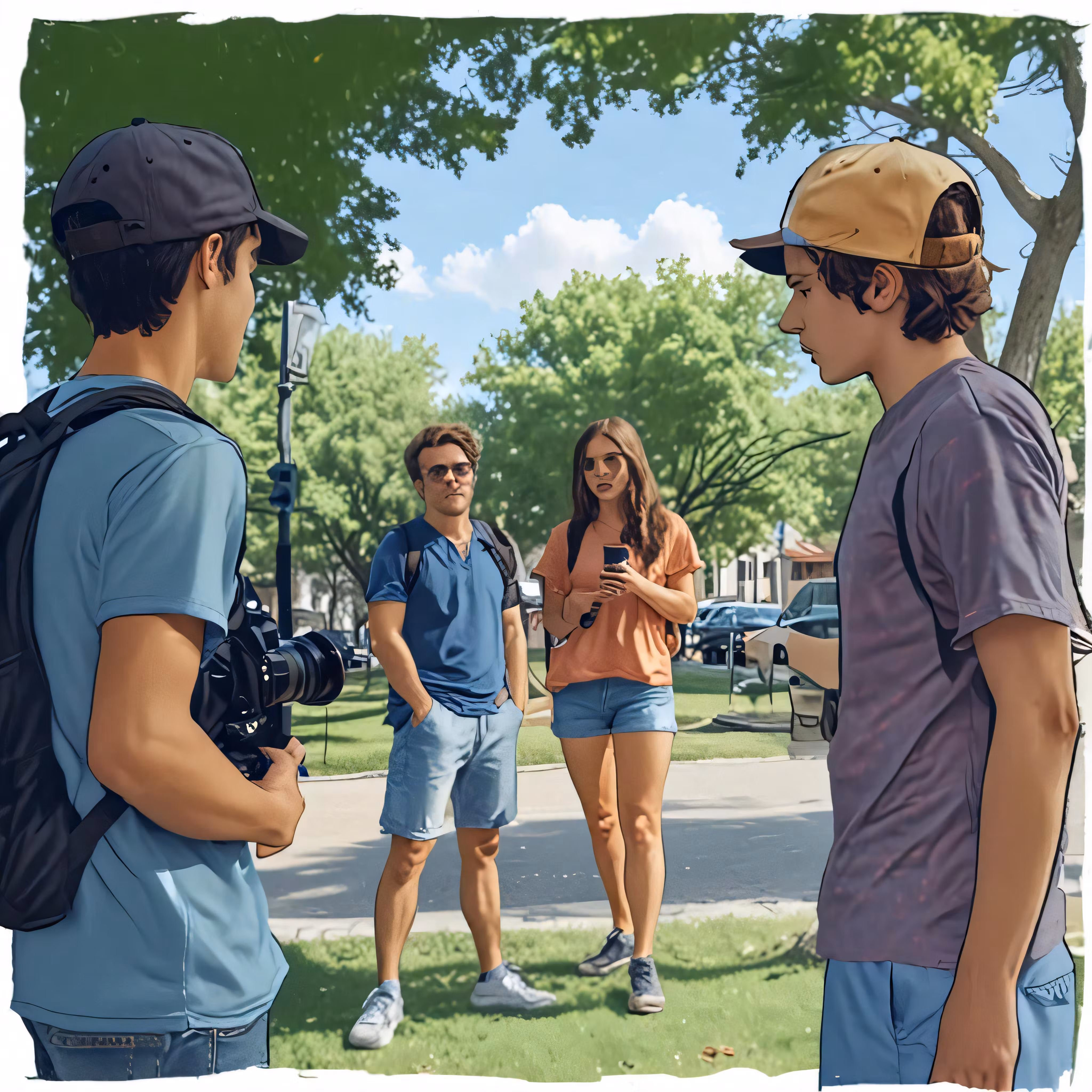 High resolution picture, free to use, a boy and girl stand together talking to a camera man