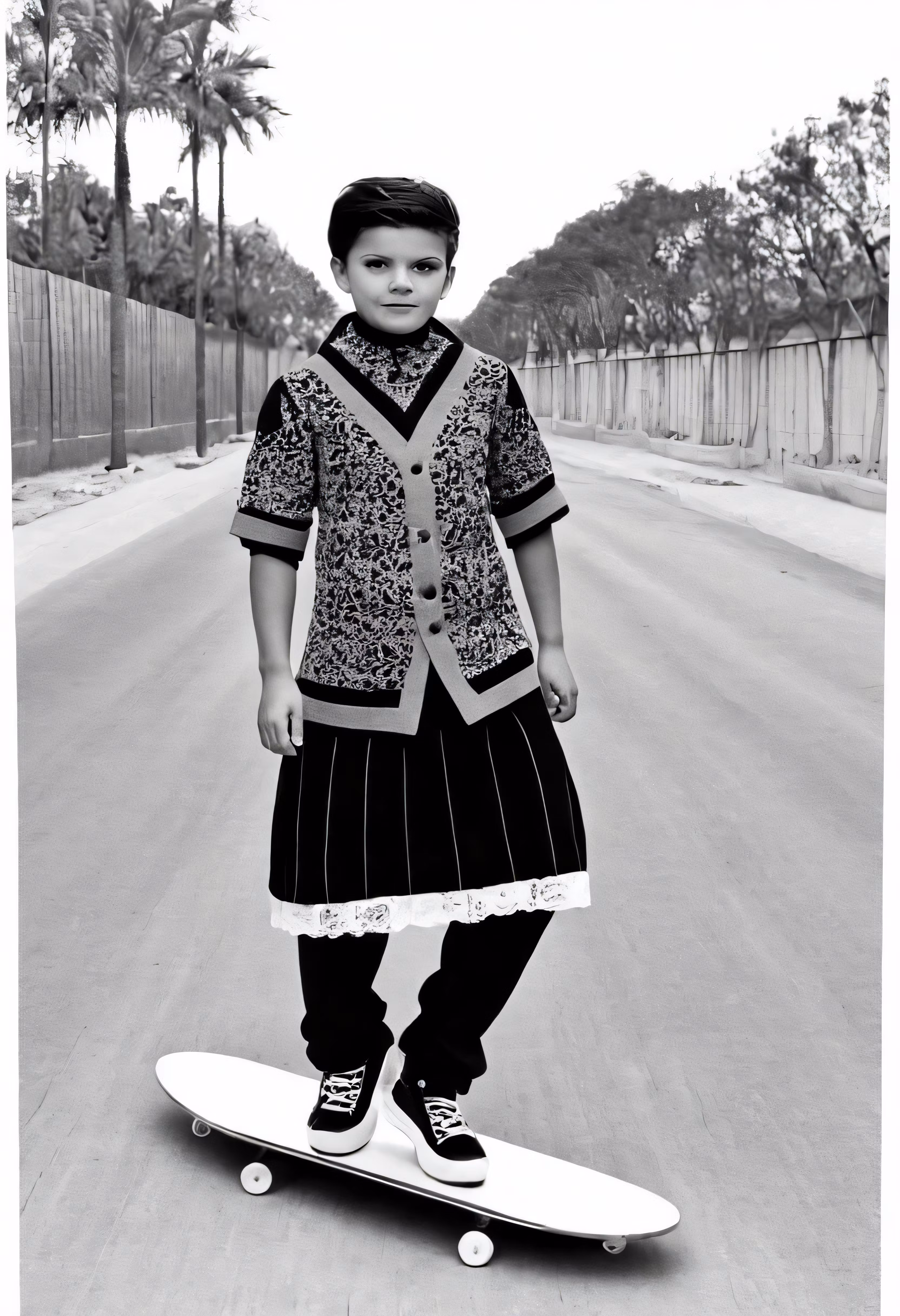 High resolution picture, free to use, a boy in a skirt riding a skate board