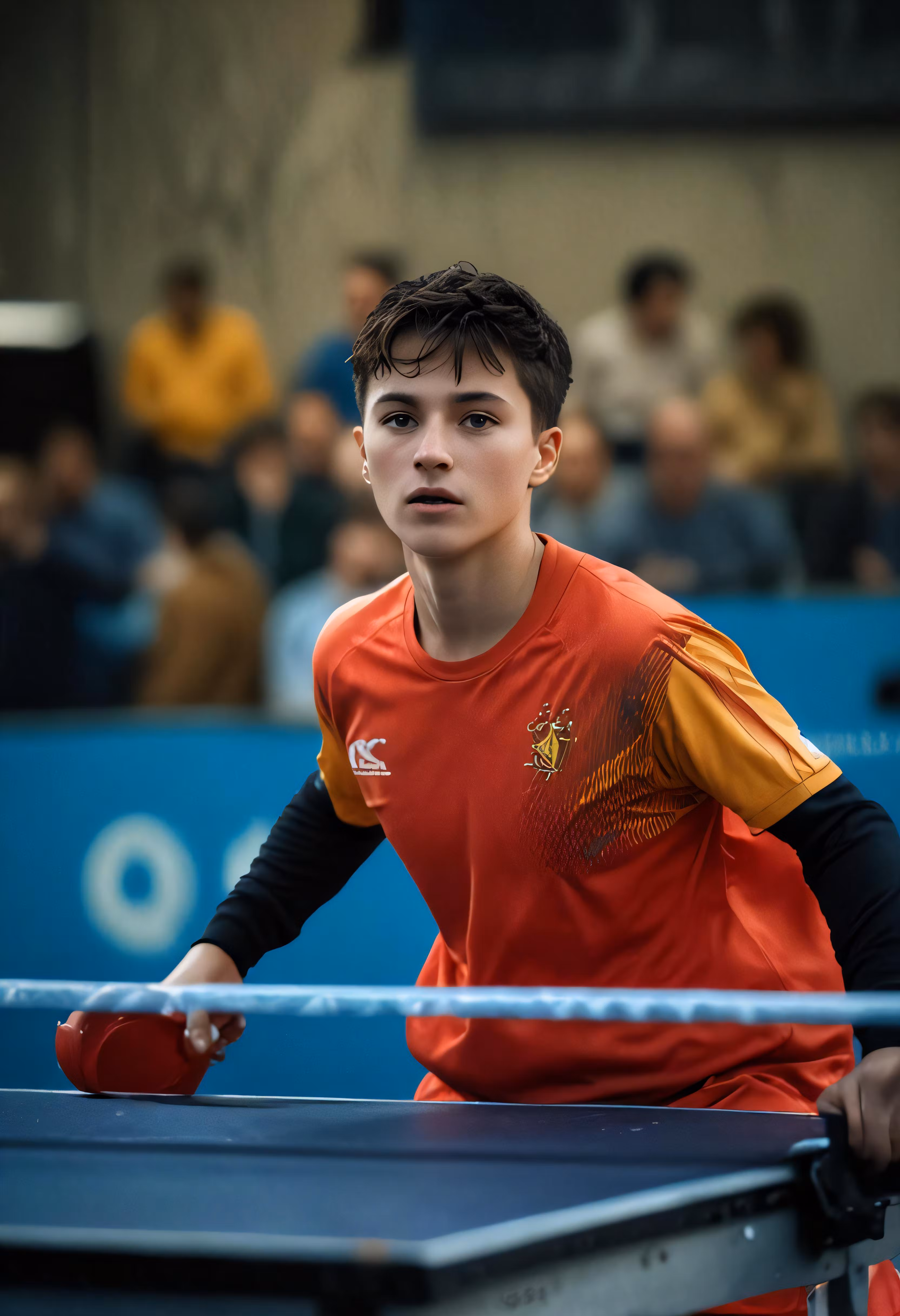 High resolution picture, free to use, a boy in orange jersey playing ping pong at a tennis match
