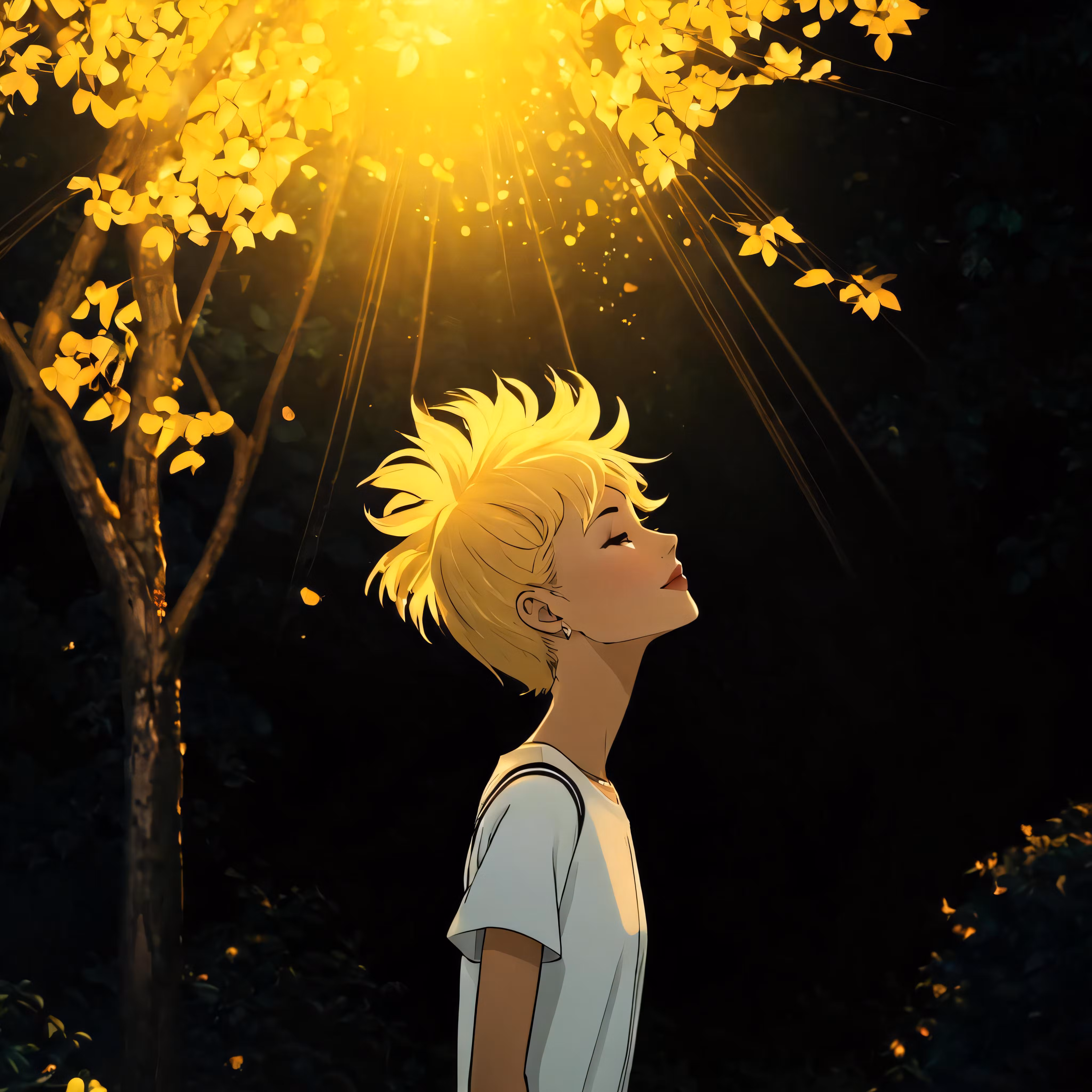 High resolution picture, free to use, a boy standing in the sun behind a tree