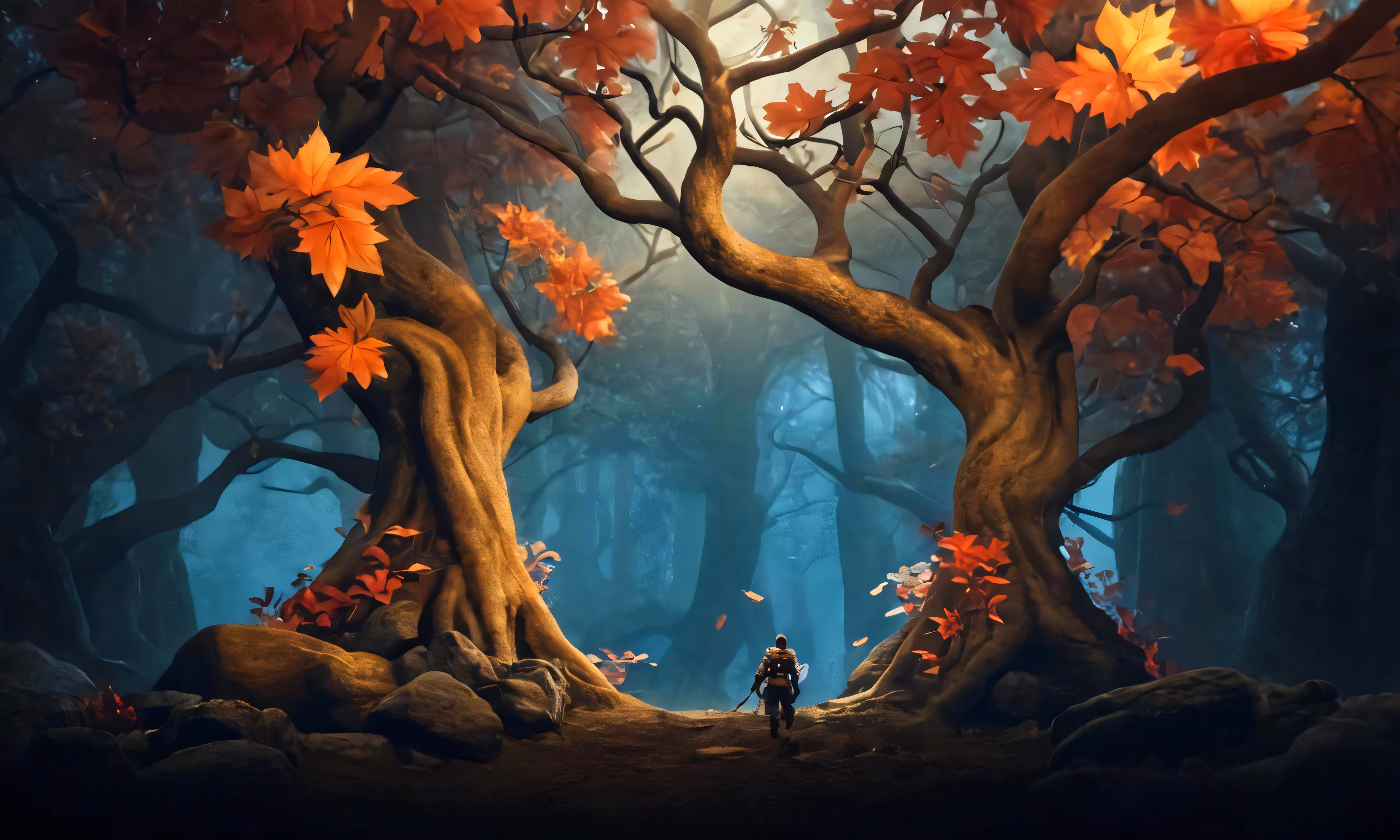 High resolution picture, free to use, a boy walking through a forest in the fall
