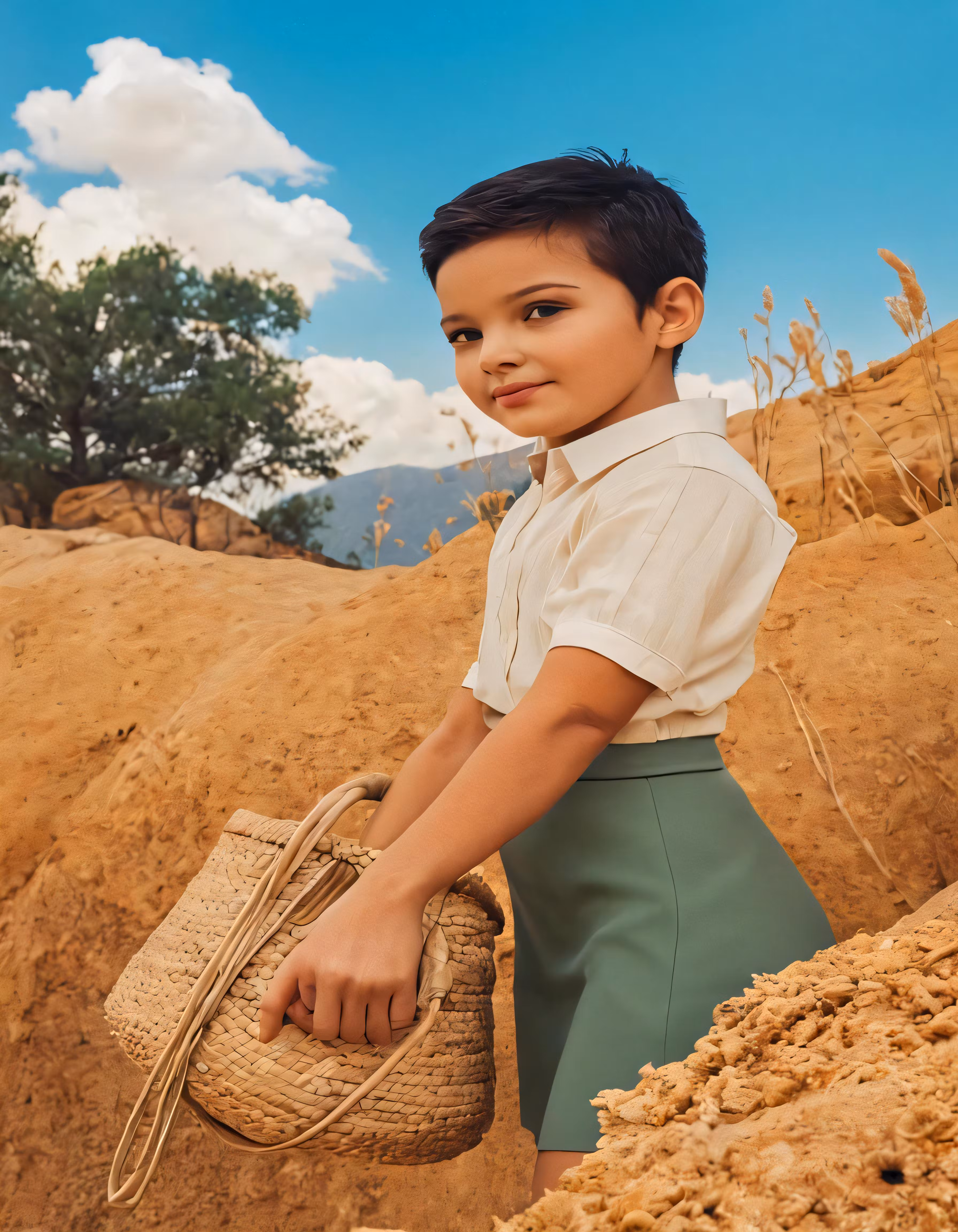 High resolution picture, free to use, a boy with a basket in a rocky terrain