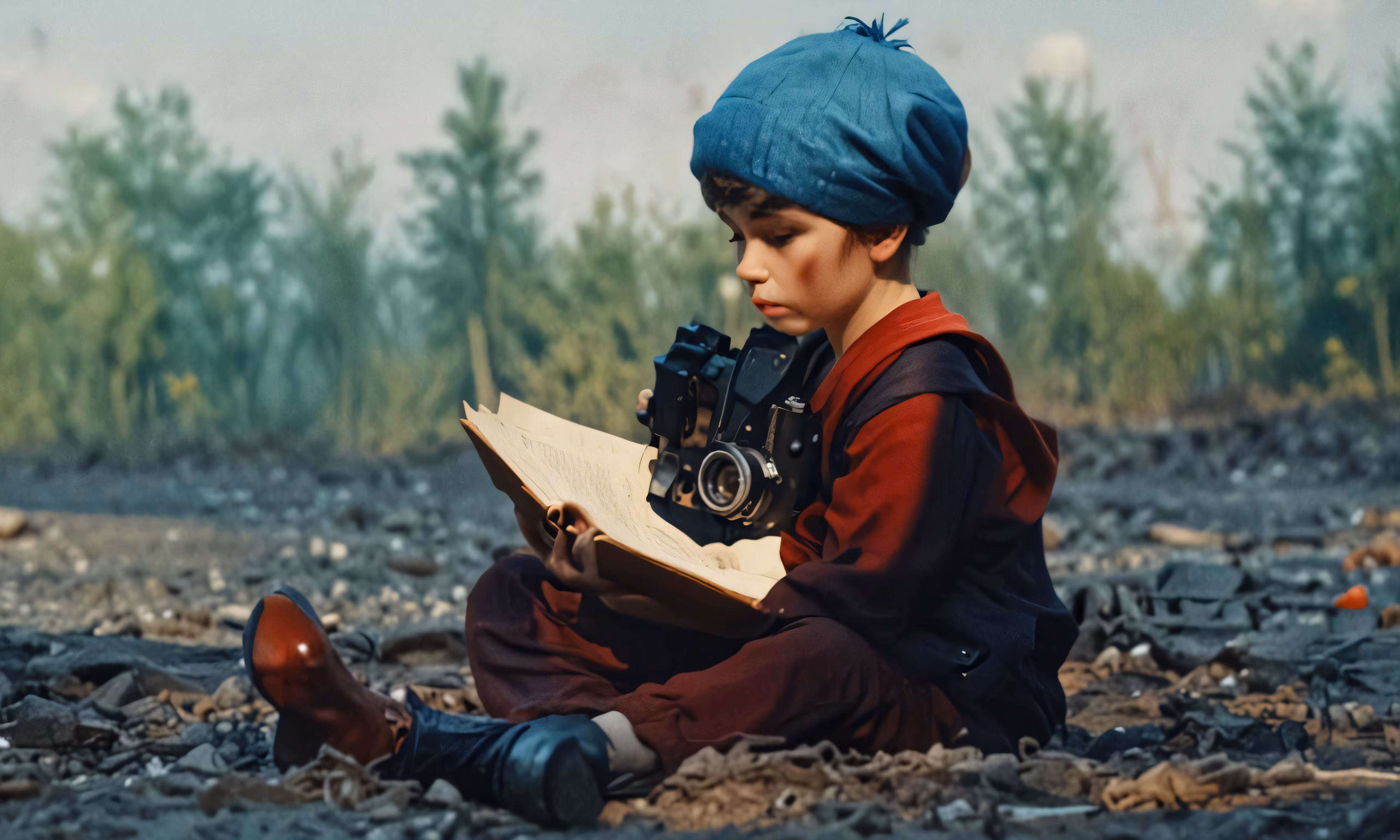 High resolution picture, free to use, a boy with a camera sits on a rocky area while reading