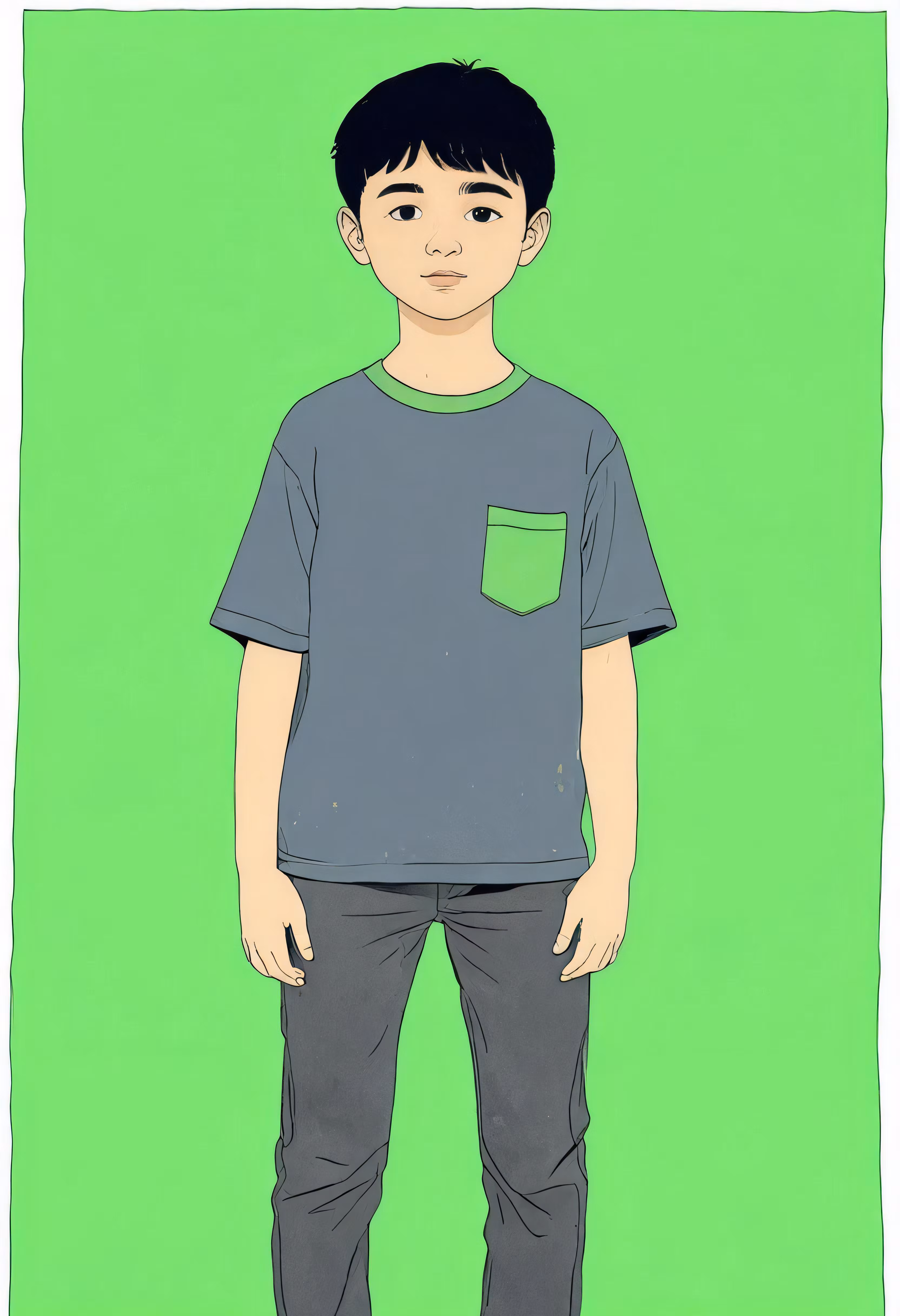 High resolution picture, free to use, a boy with black hair wearing a grey shirt and jeans