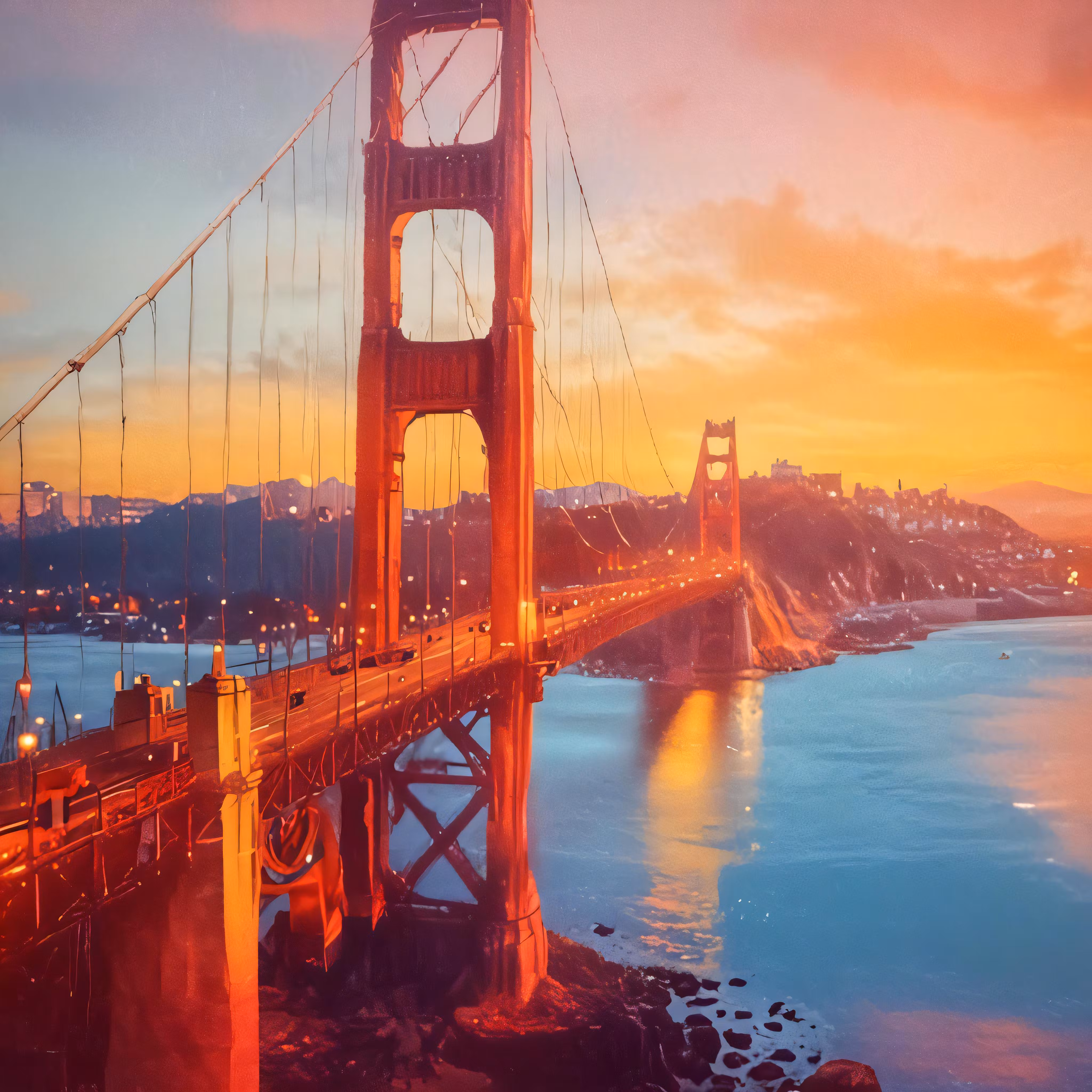 High resolution picture, free to use, a bridge lit up with lights next to water