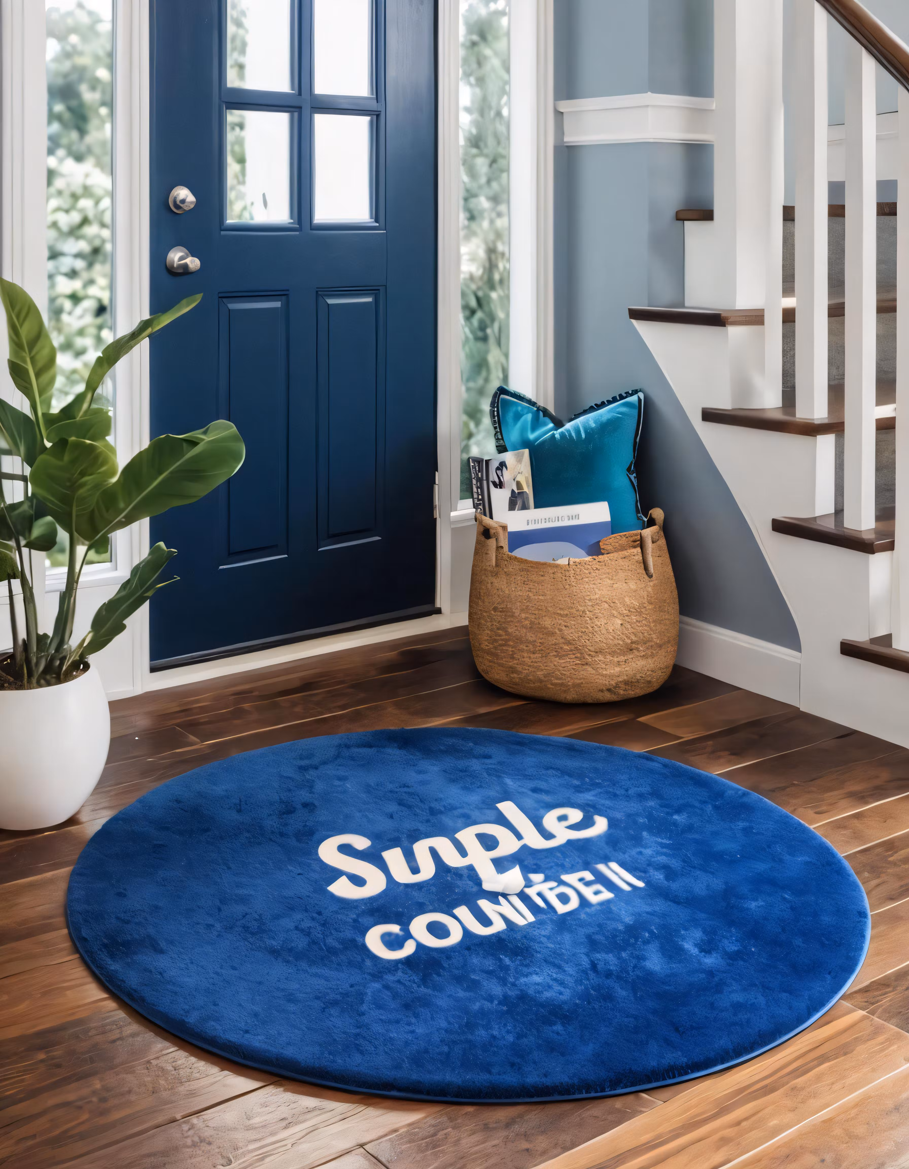 High resolution picture, free to use, a bright blue door with a large rug that says simple couvgn