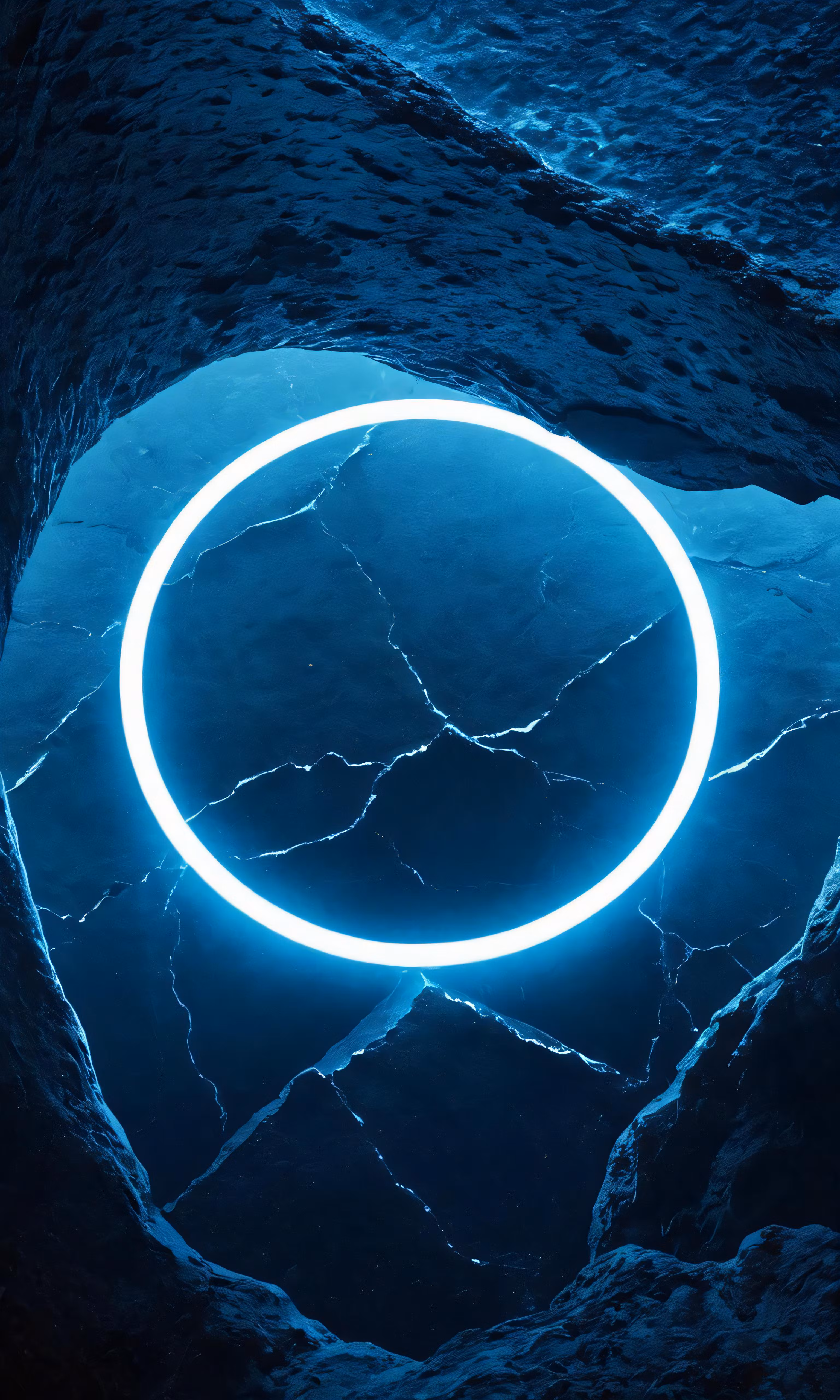 High resolution picture, free to use, a bright blue ring is lit up in a rock formation