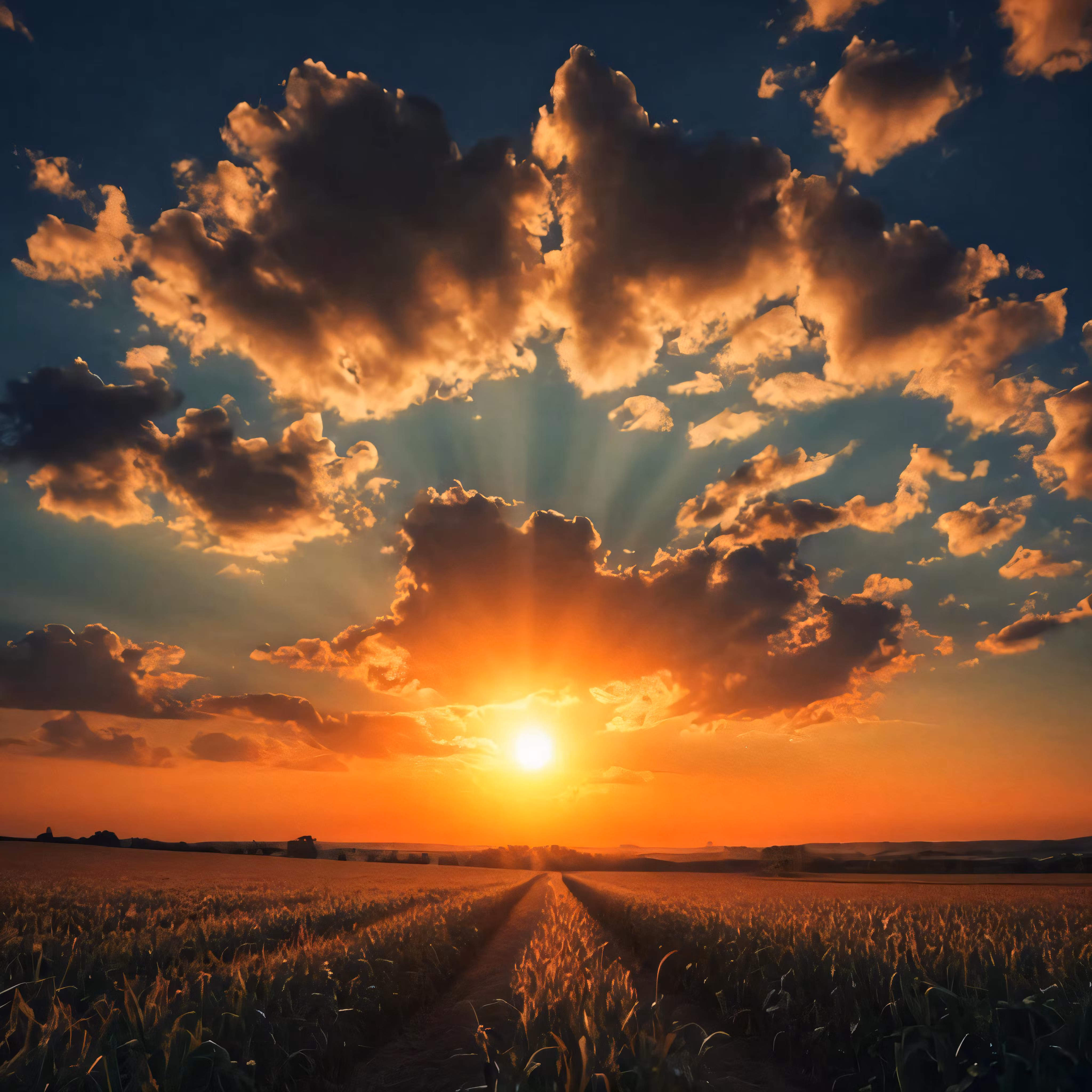 High resolution picture, free to use, a bright sunset on the horizon in a large field