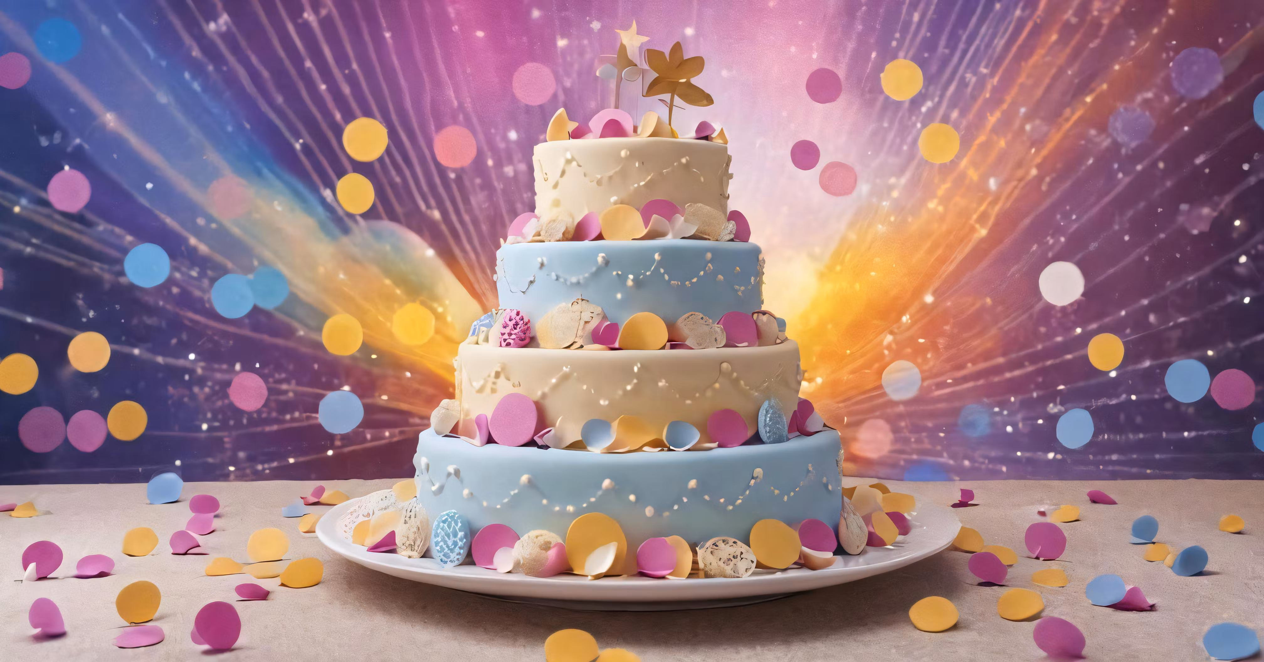 High resolution picture, free to use, a brightly colored birthday cake decorated with stars and confetti