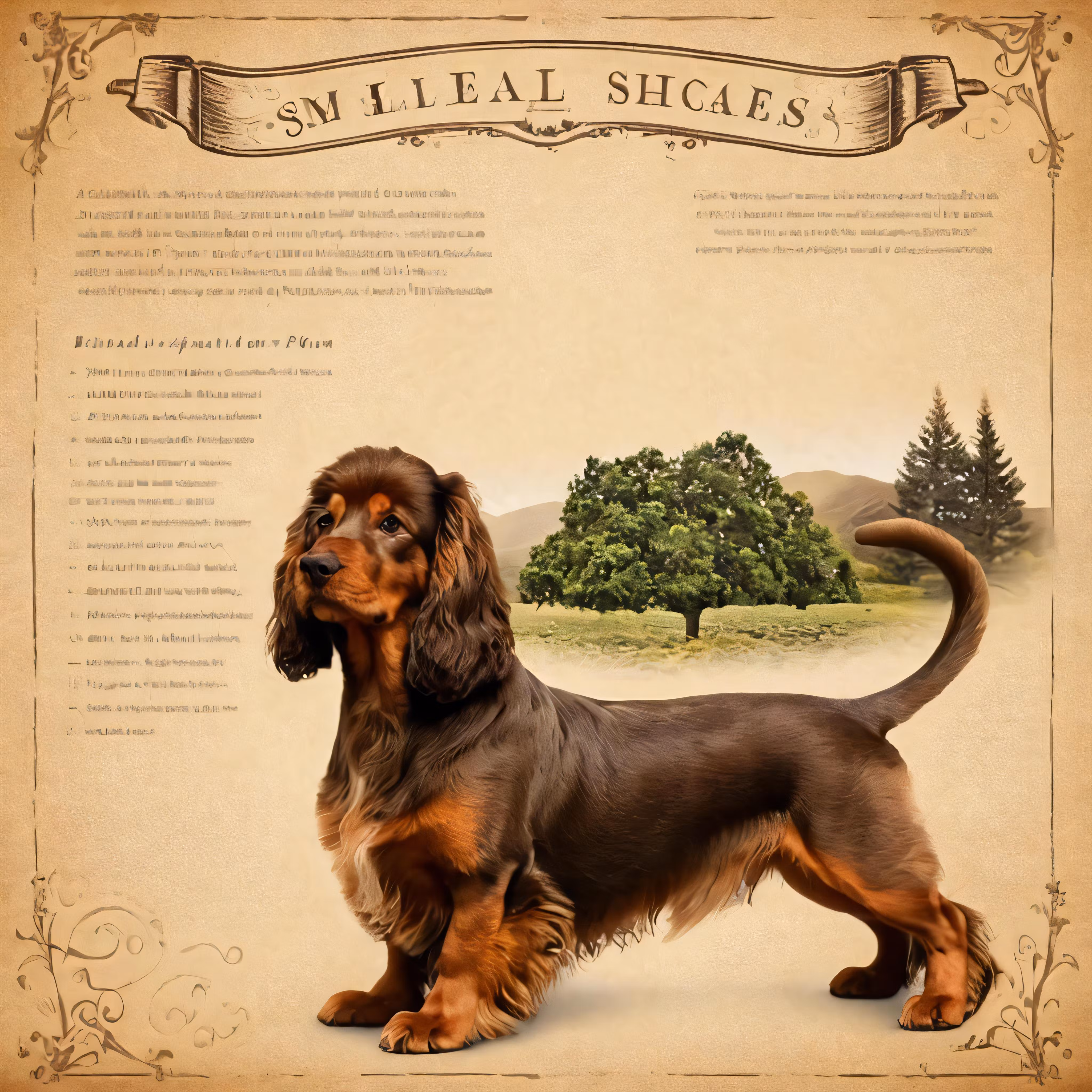 High resolution picture, free to use, a brown and black puppy is standing in front of an old paper