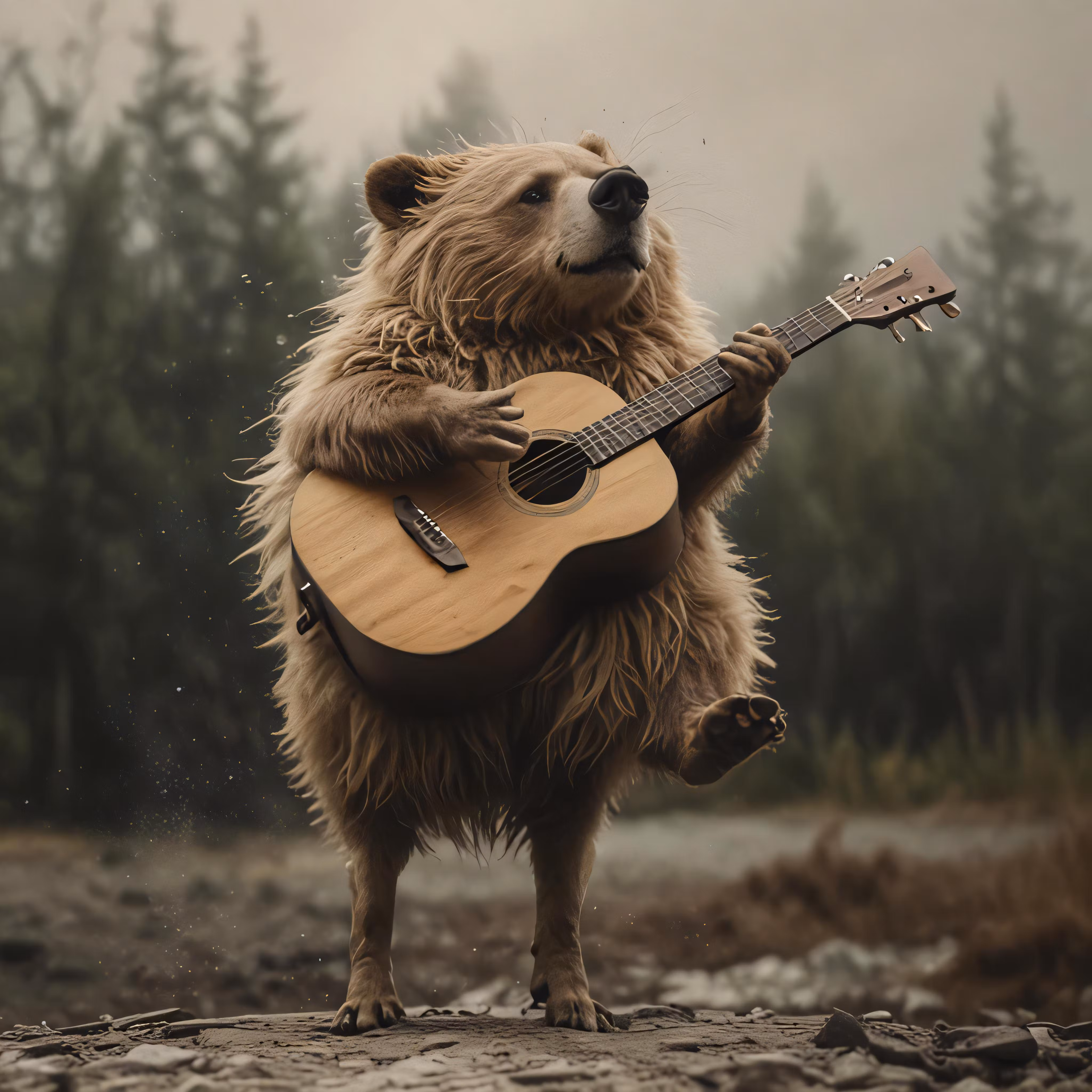 High resolution picture, free to use, a brown bear holding a guitar with trees in the background