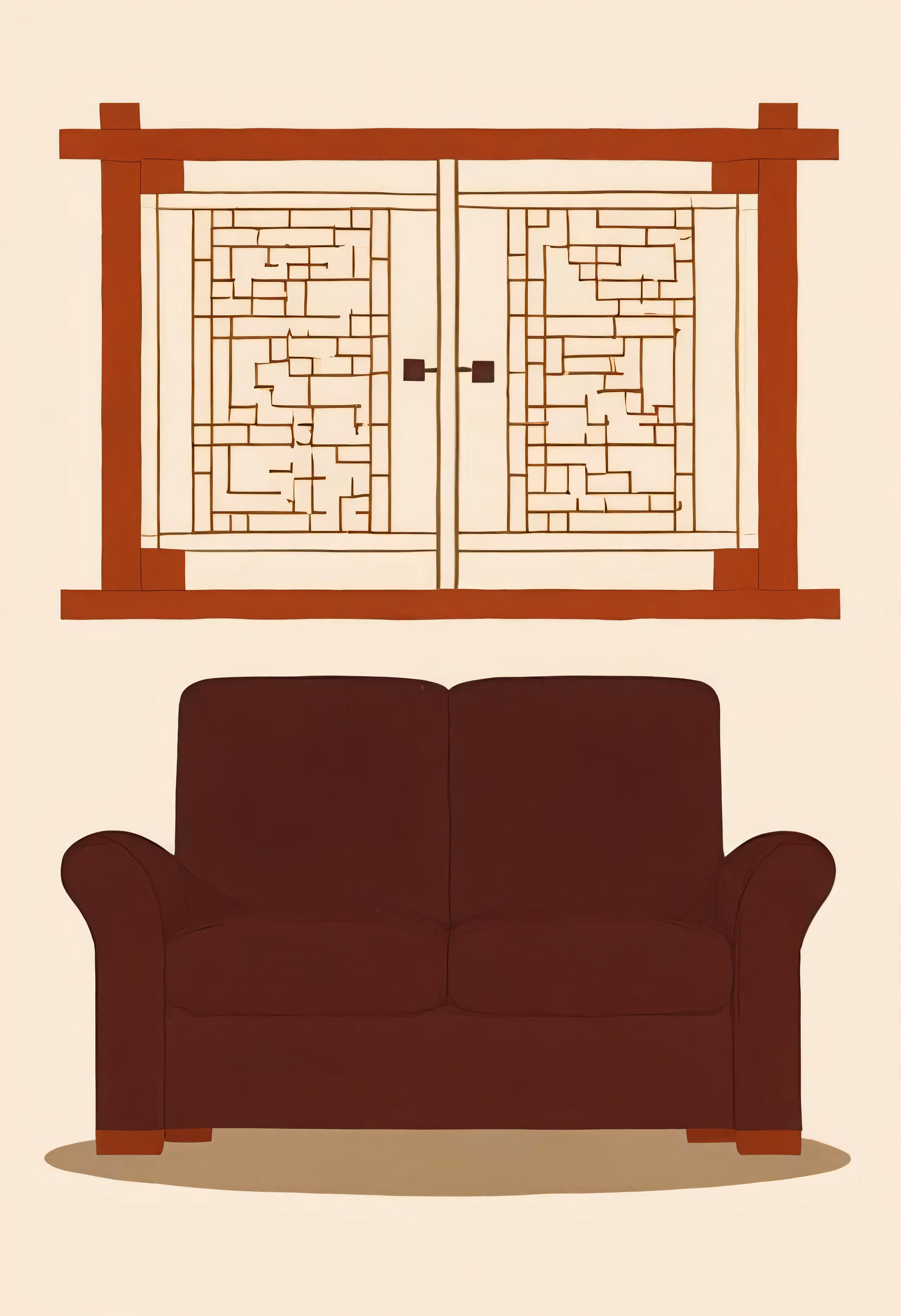 High resolution picture, free to use, a brown couch and a wall unit in a room