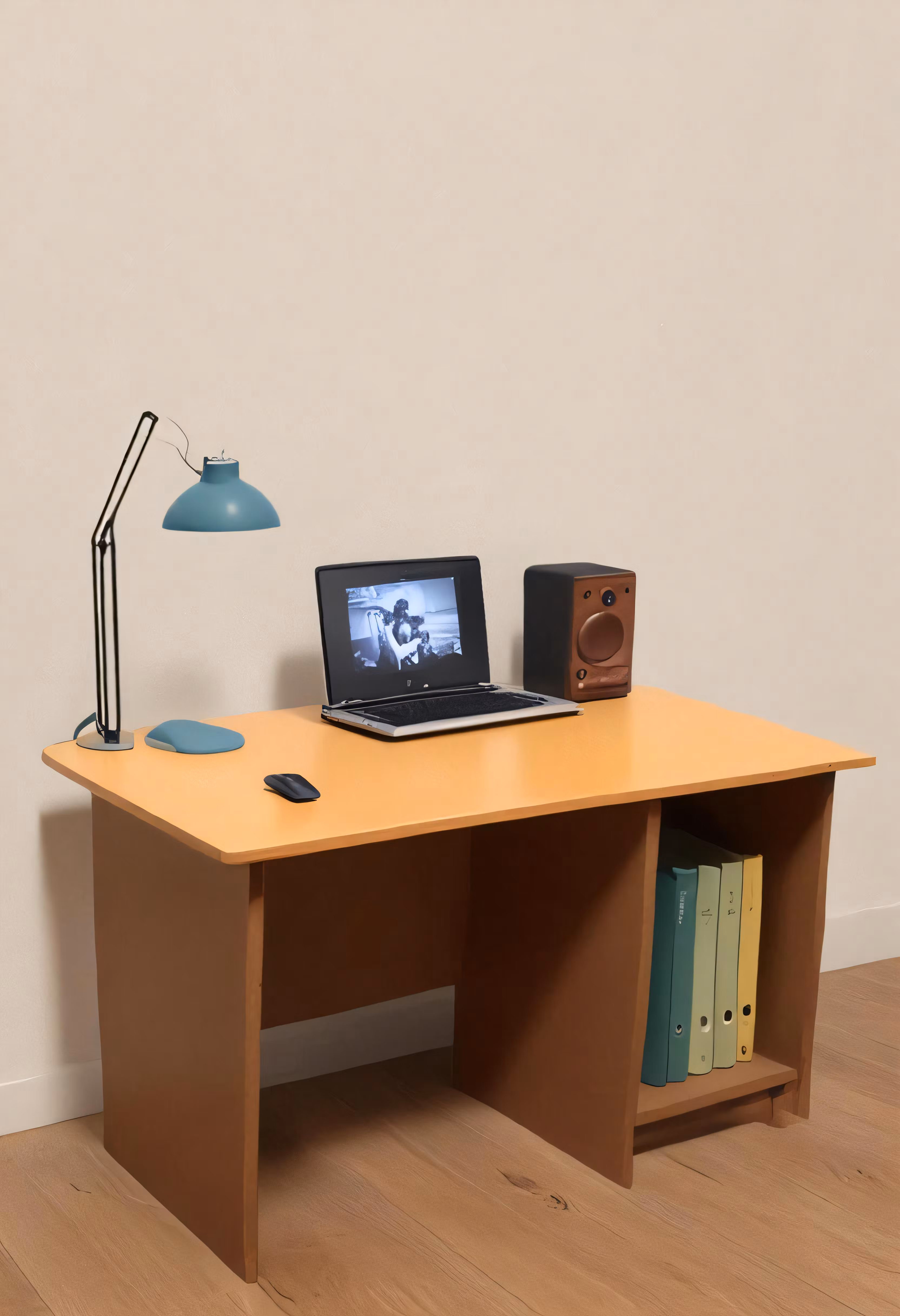 High resolution picture, free to use, a brown table with a laptop sitting on it and an extra shelf behind it