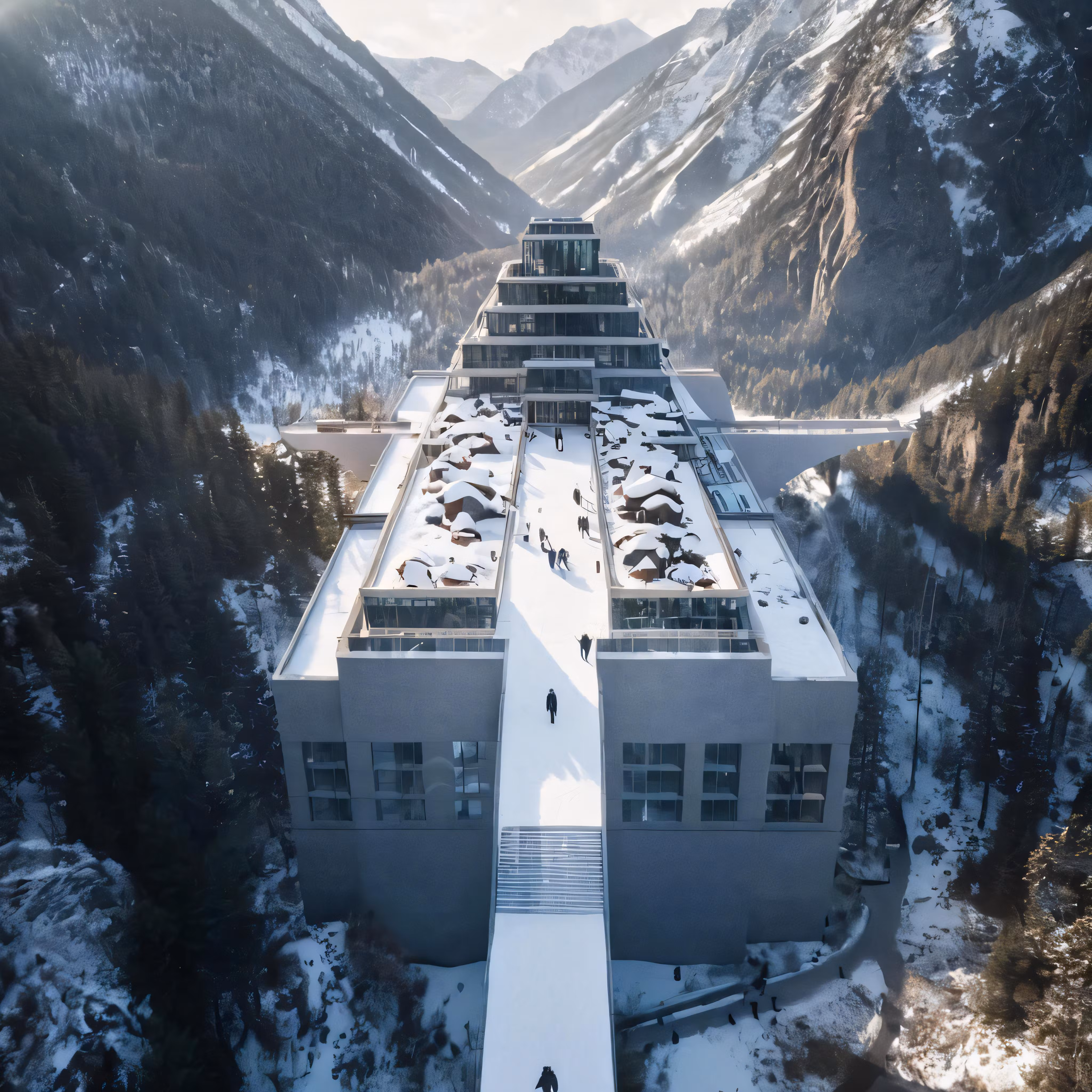 High resolution picture, free to use, a building that is made of concrete and surrounded by snowy mountains