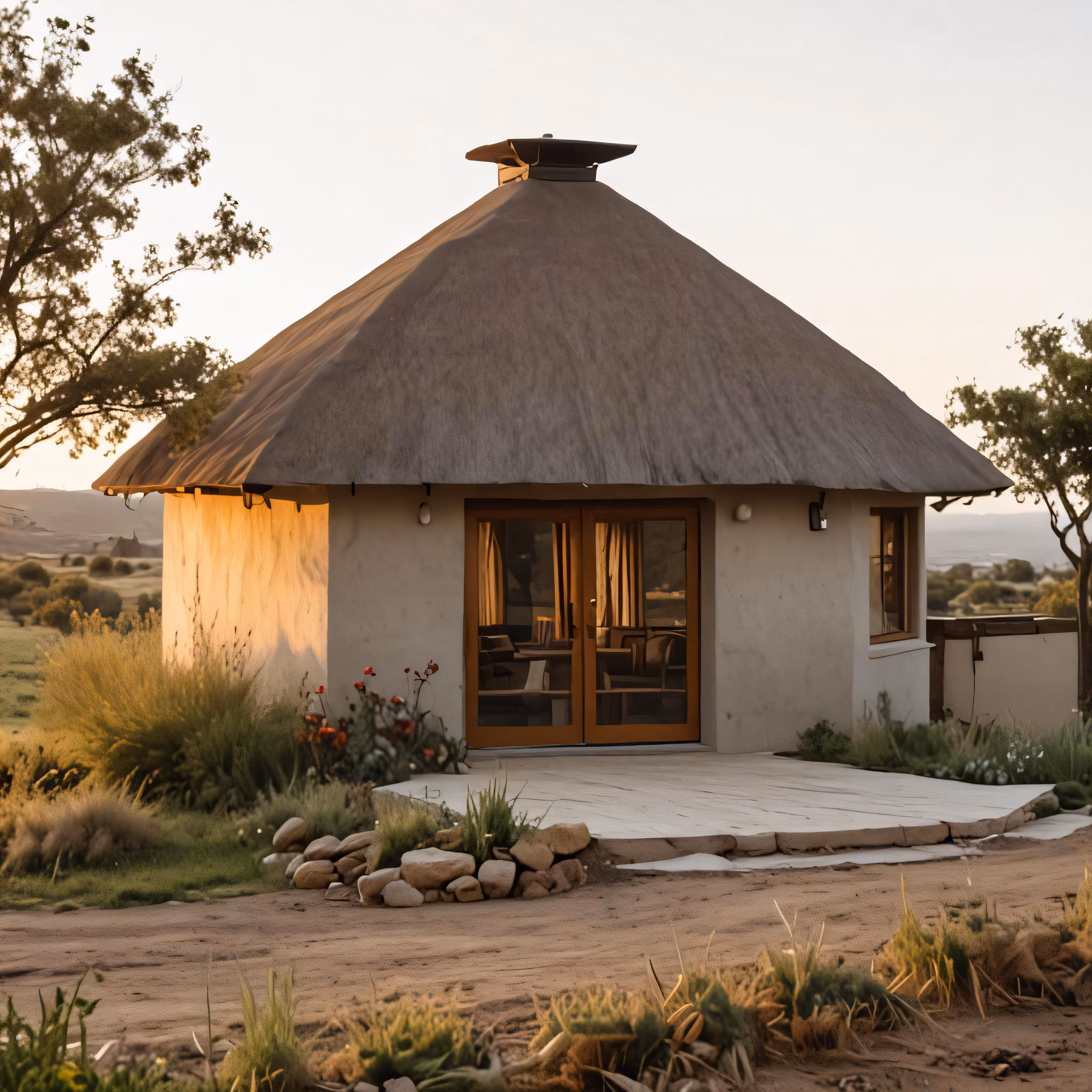 High resolution picture, free to use, a building with a thatched roof on the back of it
