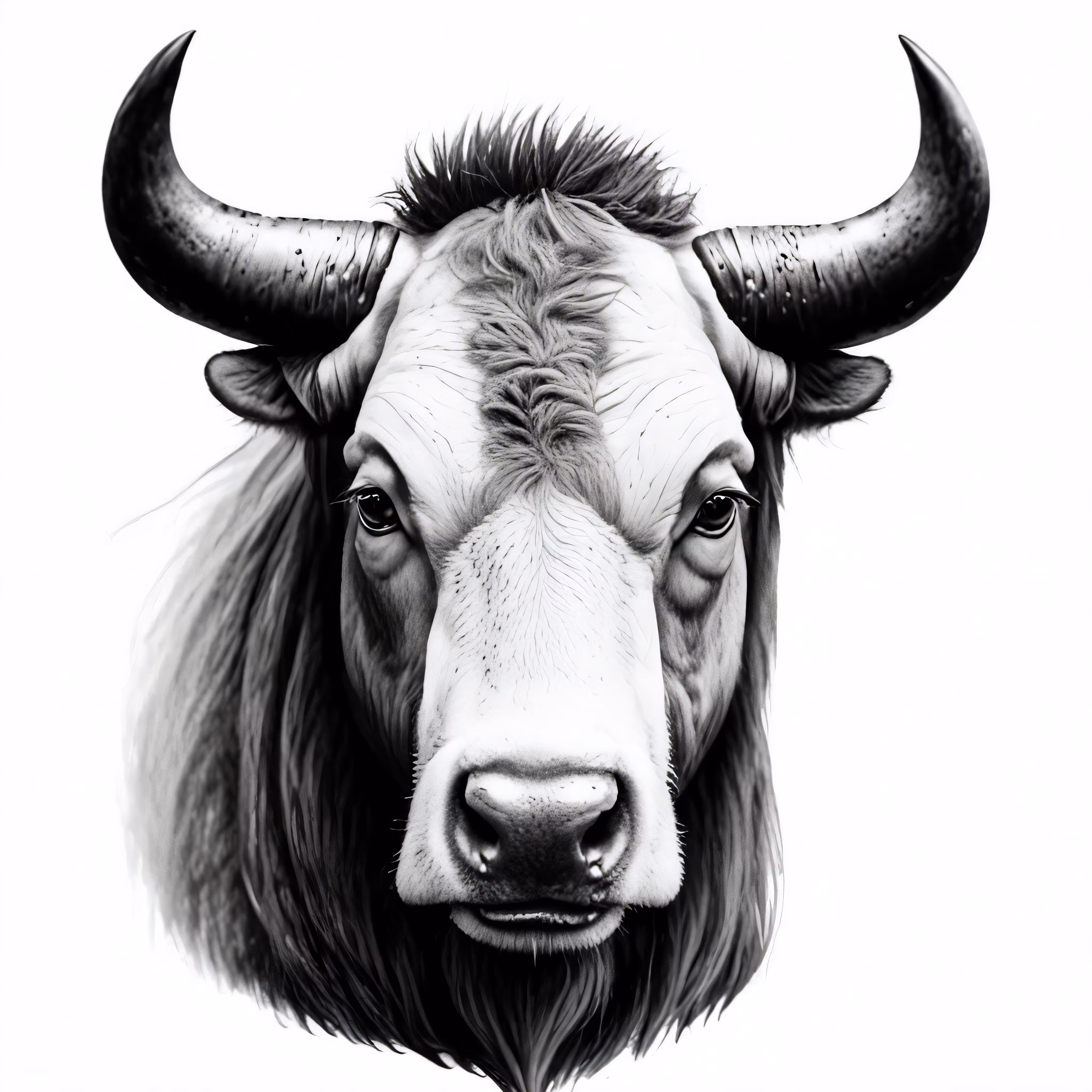 High resolution picture, free to use, a bull with horns and long hair is shown in black and white