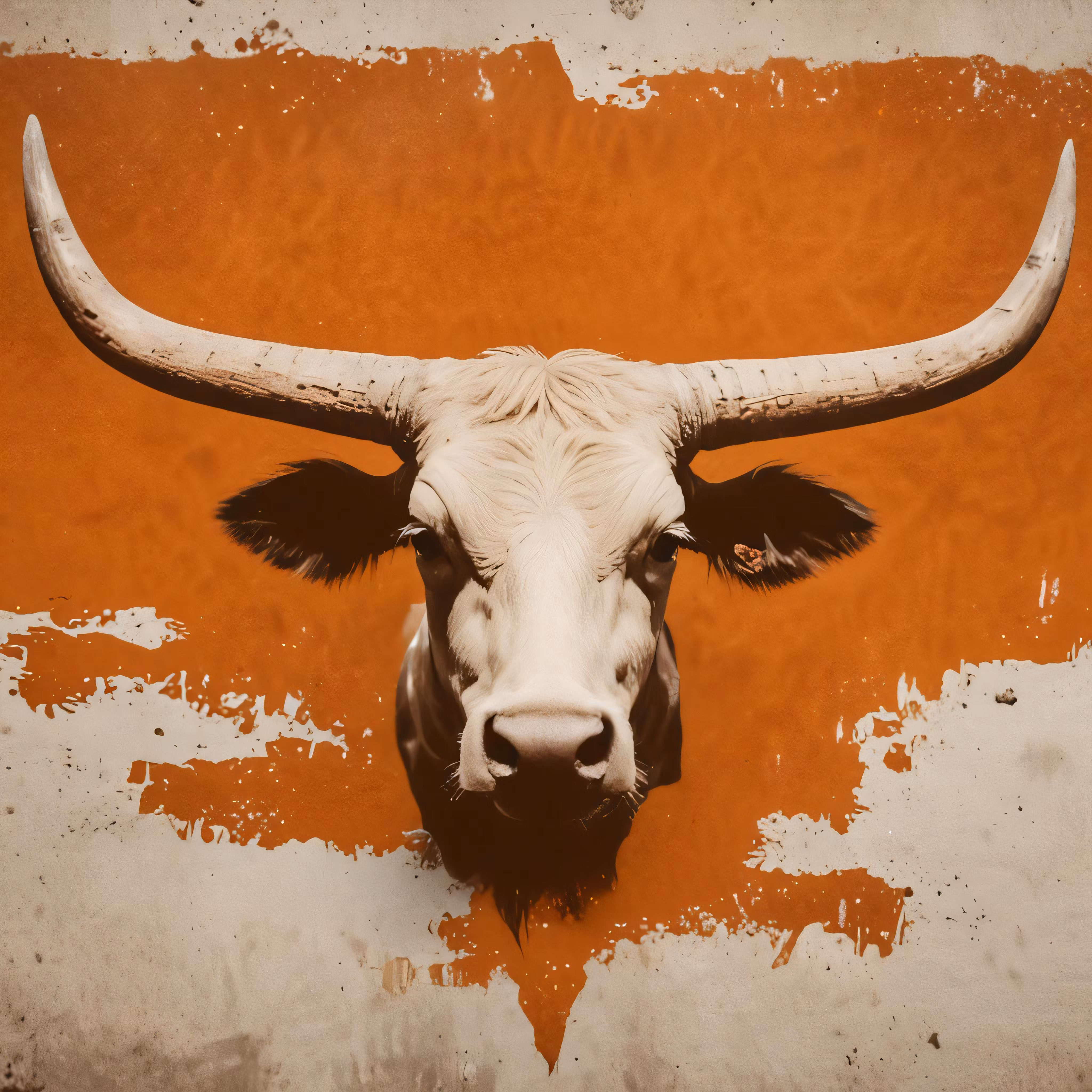 High resolution picture, free to use, a bull with horns is standing in front of an orange wall