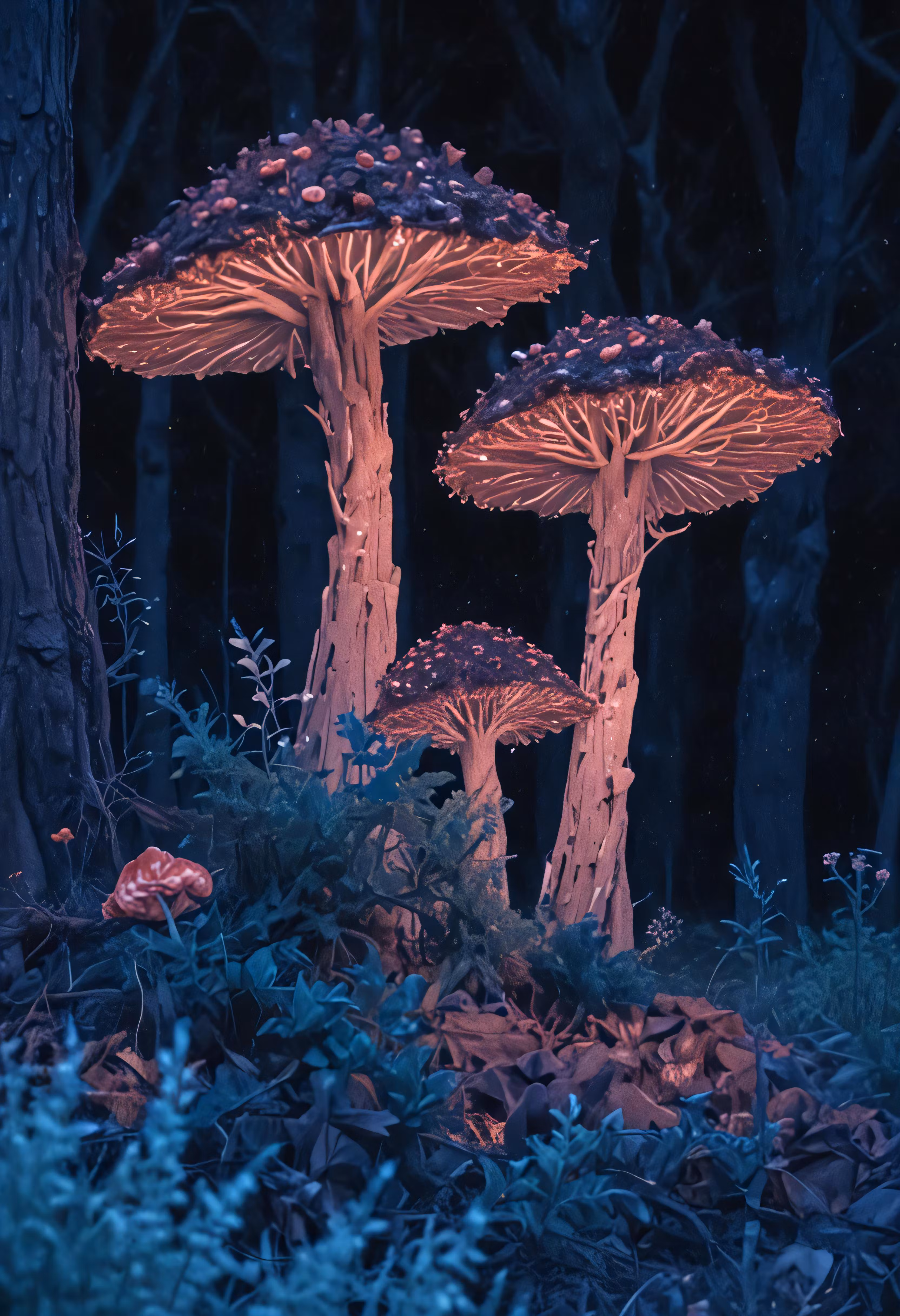 High resolution picture, free to use, a bunch of glowing mushrooms in the forest
